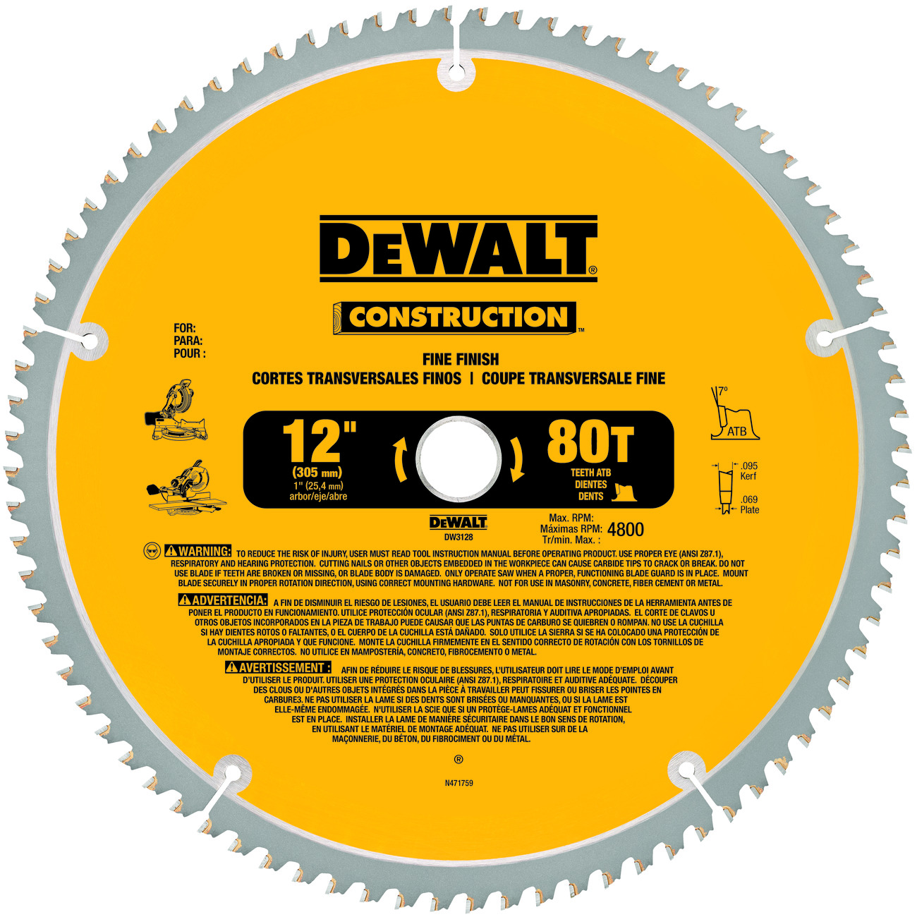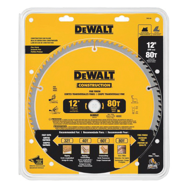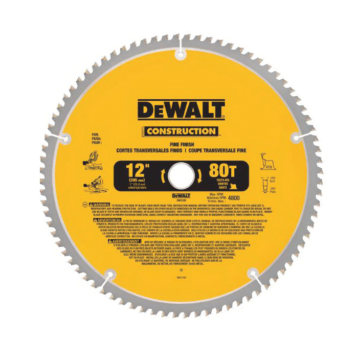 DeWALT® Guaranteed Tough® DW3128 Large Diameter Thin Kerf Circular Saw Blade, 12 in Dia x 0.069 in THK, 1 in Arbor, Carbide Blade, 80 Teeth