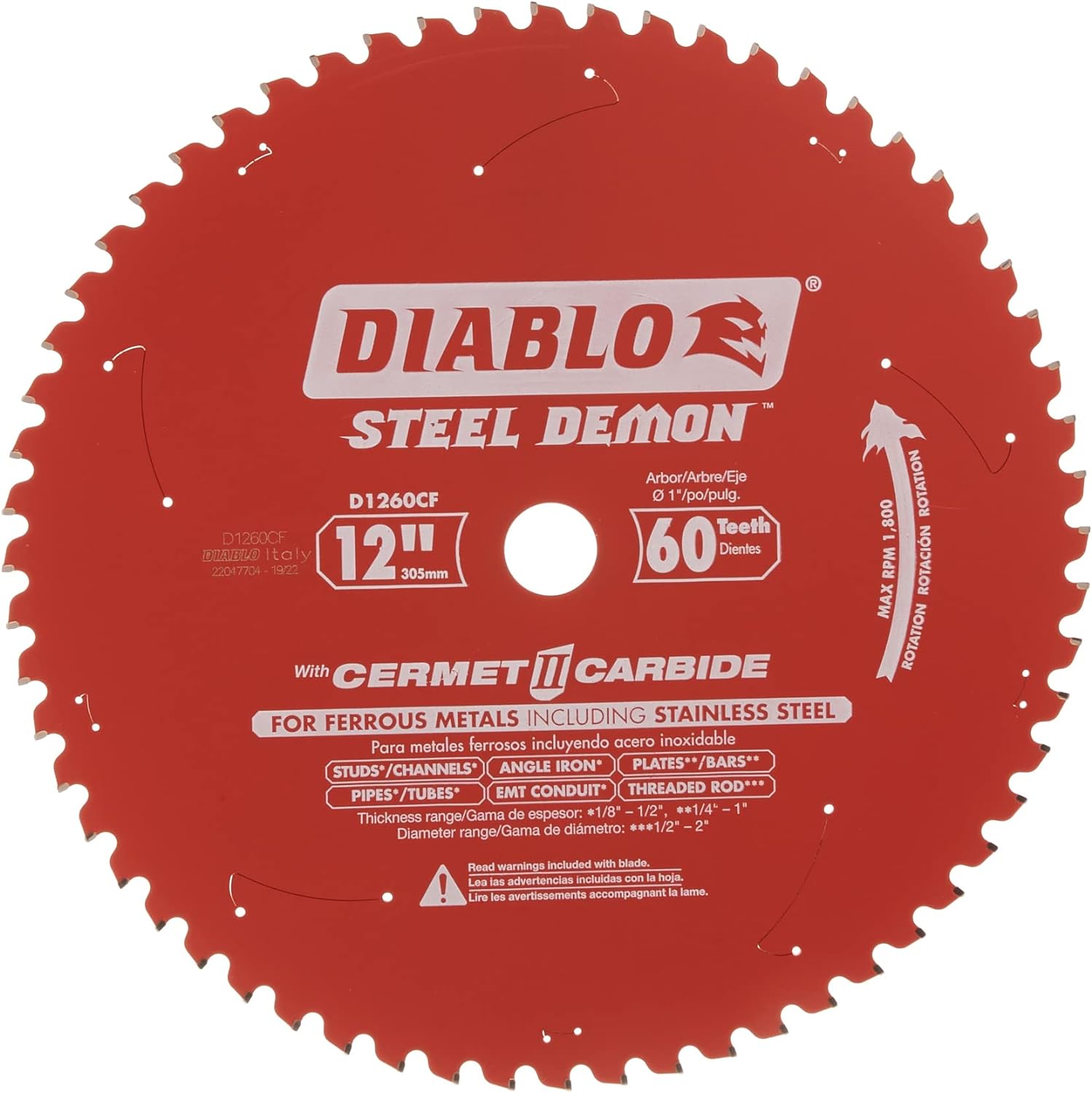 The new 12 in 60T Steel Demon® cermet blade cuts both metal and stainless steel while providing 5x the cutting performance than standard metal cutting blades. By delivering the ultimate metal cutting performance and unmatched value story, this blade will be a game changer for metal cutting! This blade is specially formulated with cermet teeth with a triple chip grind tooth design, laser cut blade bodies, anti-vibration technology and Perma-SHIELD® non-stick coating to deliver precise cuts with no sparks and cool, burr-free edges.