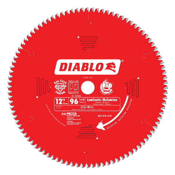 Diablo® blade features a thin kerf triple chip design that is specially designed to cut laminate flooring, double-sided laminates and melamine cleanly, leaving a smooth finish with no chipping or tear-out. Laminated materials are highly abrasive, so these blades feature a TiCo™ carbide blend ideally suited to harsh service. Diablo® blade is ideal for 12 in sliding miter saws and portable table saws.