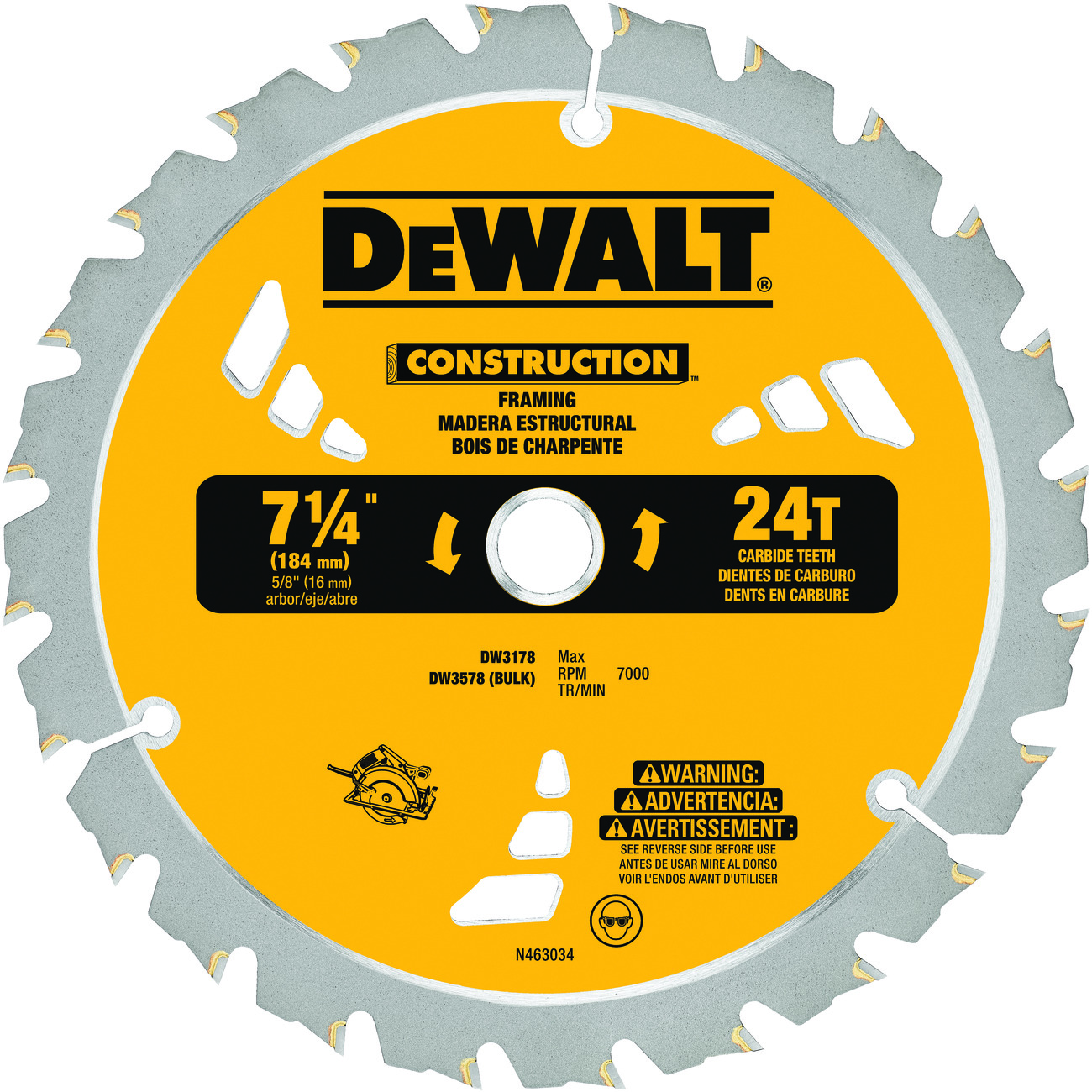 DeWALT® Guaranteed Tough® DW3178 Portable Small Diameter Thin Kerf Circular Saw Blade, 7-1/4 in Dia x 0.045 in THK, 5/8 in Arbor, Carbide Blade, 24 Teeth