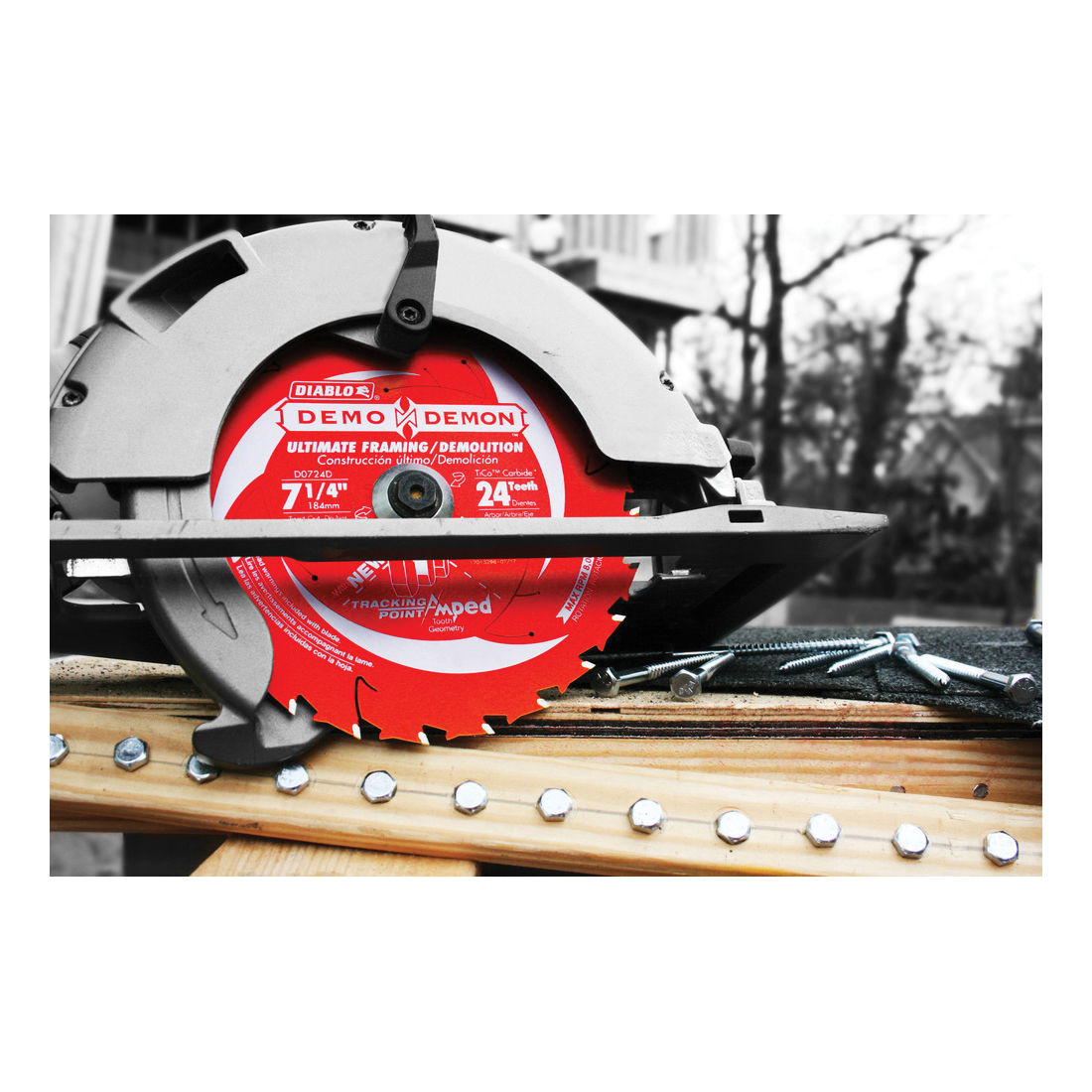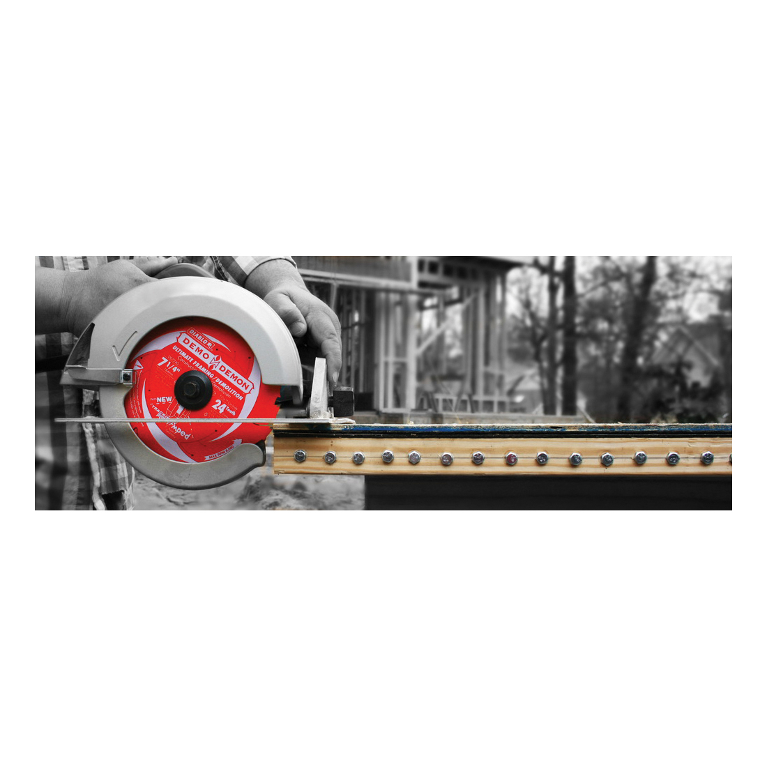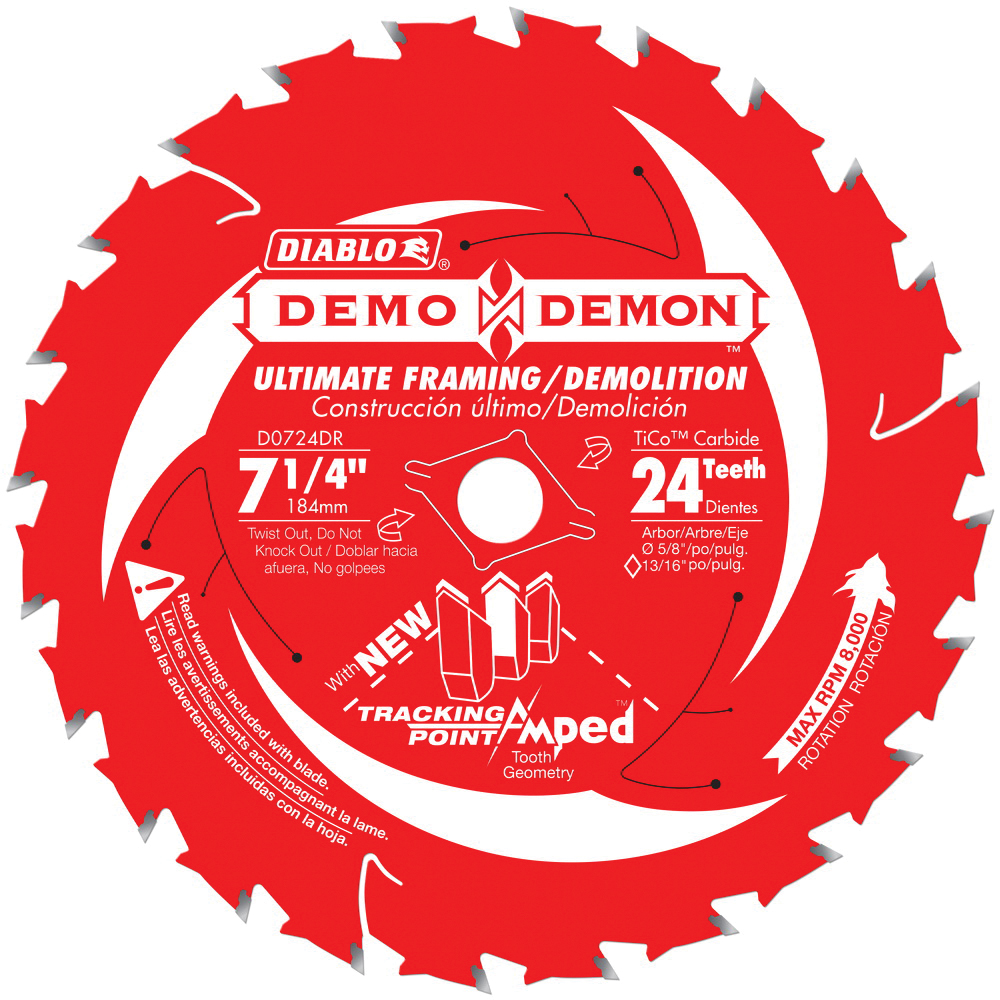 New Demo Demon® Amped™, the ultimate framing and demolition saw blade for up to 10 times cutting performance in intense applications. This 7-1/4 in 24-tooth blade includes a new industry-first tooth grind sequence, Tracking Point Amped™ that is specifically designed to provide extreme durability and effortless cuts; even when cutting abrasive materials such as shingles, bolts or nail-embedded wood.