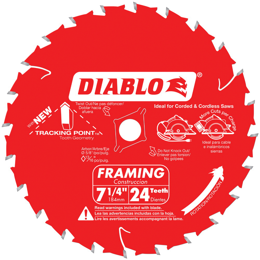 Diablo® framing blades give exceptional long life in ripping and crosscutting applications. Diablo® thin kerf requires less power from your saw, so it's the perfect blade for portable tools. Laser-cut stabilizer vents for reduced vibration and precise cuts. Durable micro grain titanium carbide for razor sharp cuts and long life. Perma-SHIELD® permanent coating is a superior aluminum alloy coating that helps reduce friction, heat build-up, gumming and is resistant to rust, which add up to longer blade life. Laser-cut thin kerf gives fast, clean cuts.