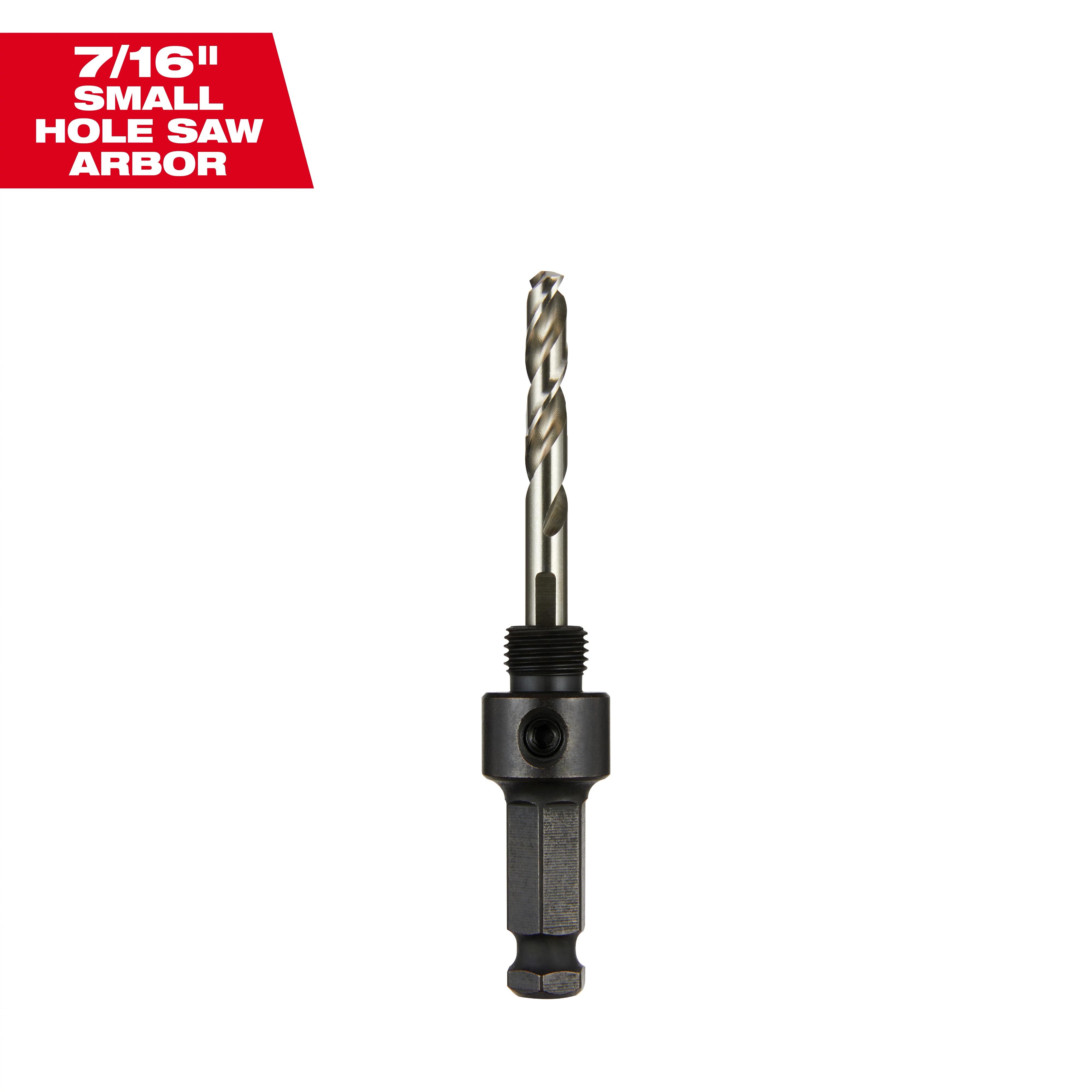 This Milwaukee hole saw arbor has a 7/16 in. hex shank for greater gripping capability in the chuck. It can be used in 1/2 in. capacity drills and larger. The arbor has a 1/2 - 20 thread and can be used on hole saws from 9/16 in. to 1-3/16 in.. it can be used with 49-56-8000, 49-56-8002 and 49-56-8005 pilot bits. Pilot bit 49-56-8000 is supplied with this arbor for use on wood and metal. One arbor and pilot per package.