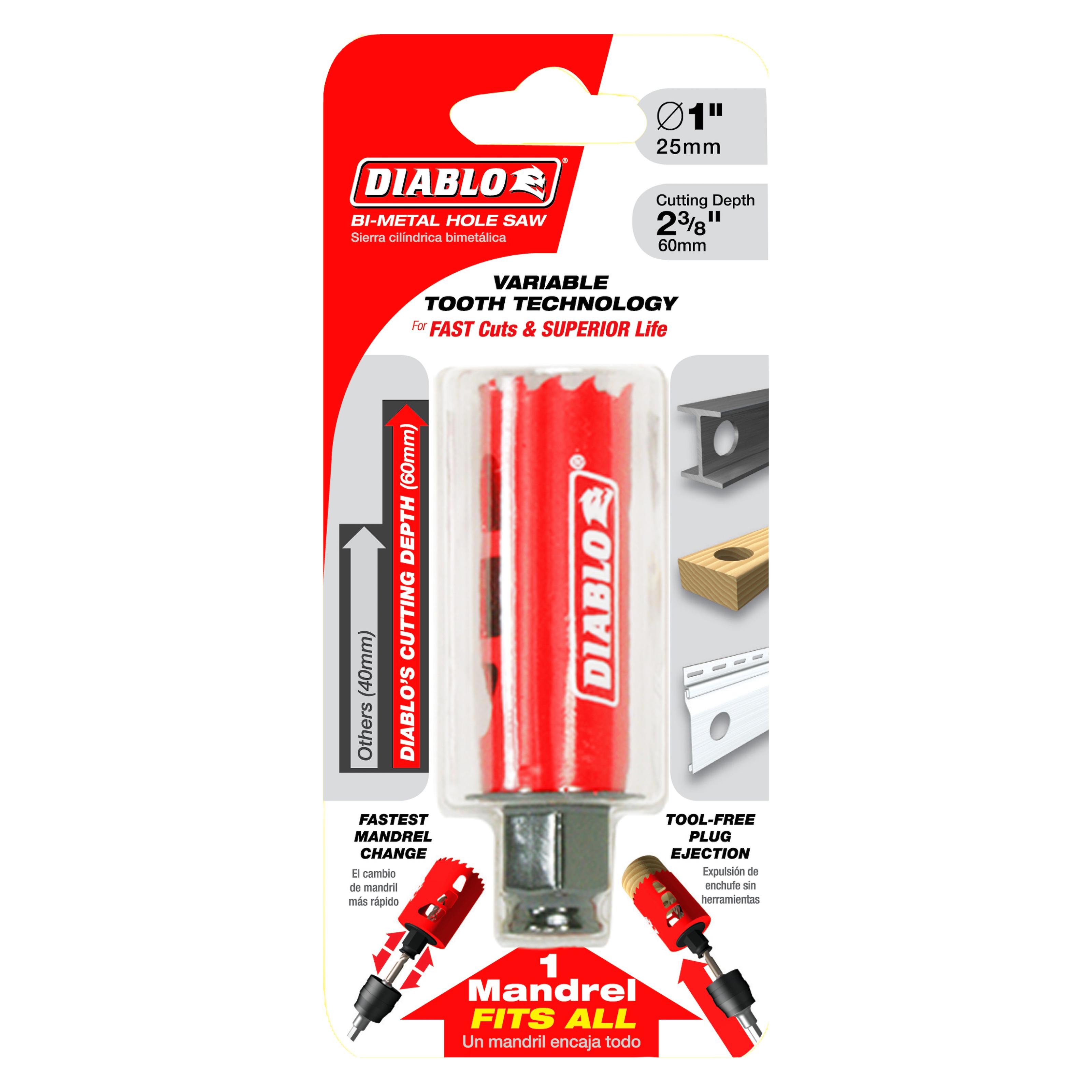 Diablo's new, high performance hole saws deliver faster cutting performance and increased productivity. Unlike anything on the market, Diablo's hole saw system and mandrel design simplify the attachment process for fast and efficient hole saw mounting. These radical new hole saws provide ultimate cutting length to bore deeper holes in a single pass, tool-free plug ejection and Variable Tooth Design for faster cuts.