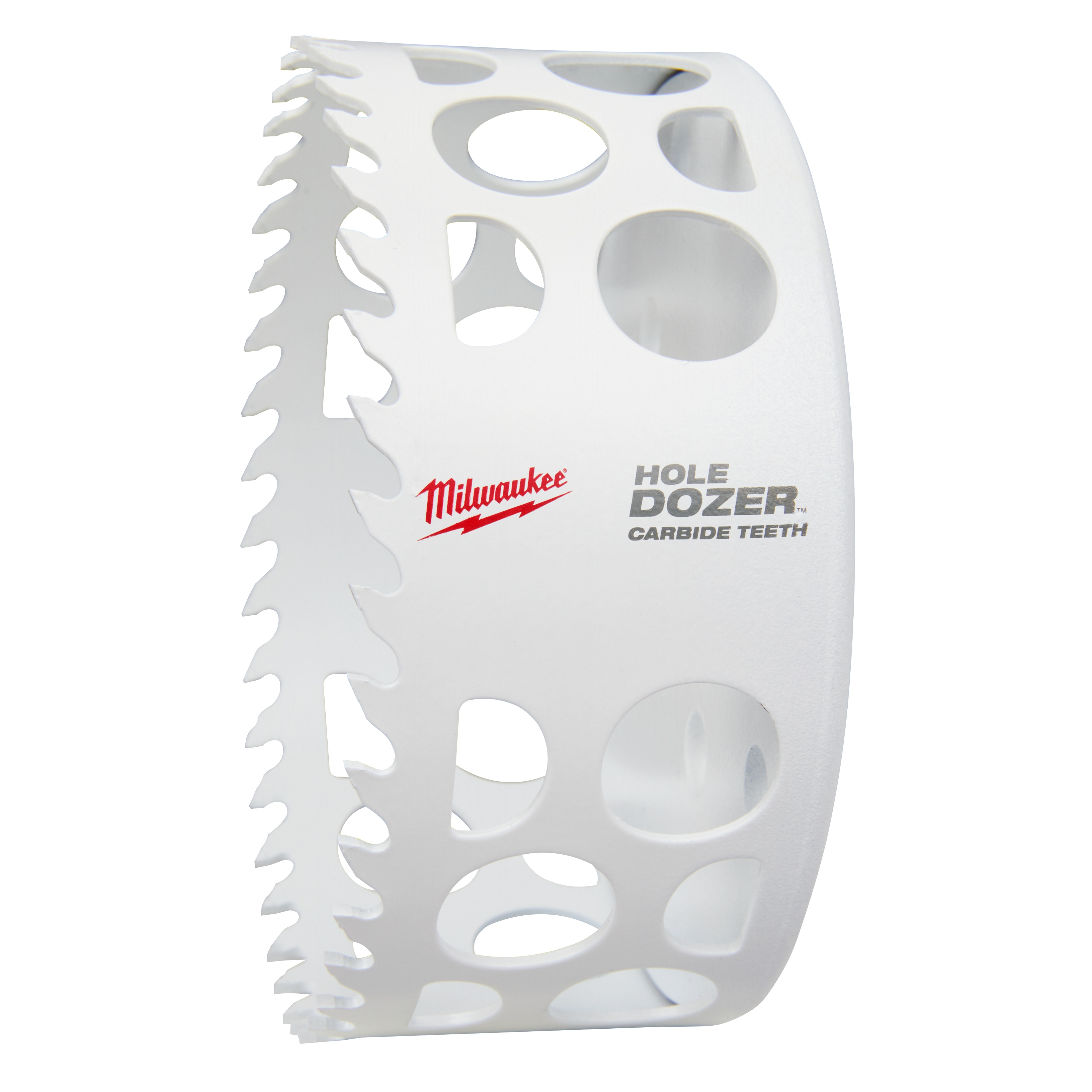 The MILWAUKEE® 4-1/4" HOLE DOZER™ with Carbide Teeth Hole Saw features a new 3 TPI design that offers fast cuts with the durability of a bi-metal hole saw and life of a carbide hole saw. This Milwaukee hole saw provides the longest life in general purpose and extreme materials with the ability to cut through stainless steel, cast iron, fastener embedded wood, cement board, fiberglass, plaster, asphalt shingles, and more with ease. Deep gullets clear material fast while cutting, and Milwaukee's ALL-ACCESS SLOTS solve the frustration of plug removal for more productivity with less downtime between holes. The new slot design also provides increased pilot visibility for accurate placement and faster chip ejection keeping cuts cool. The HOLE DOZER™ with Carbide Teeth Hole Saw has a cutting depth of 1.62 in., allowing clearance to handle cuts in a wide range of materials. Milwaukee HOLE DOZER™ with Carbide Teeth Hole Saws are proudly made in the USA.