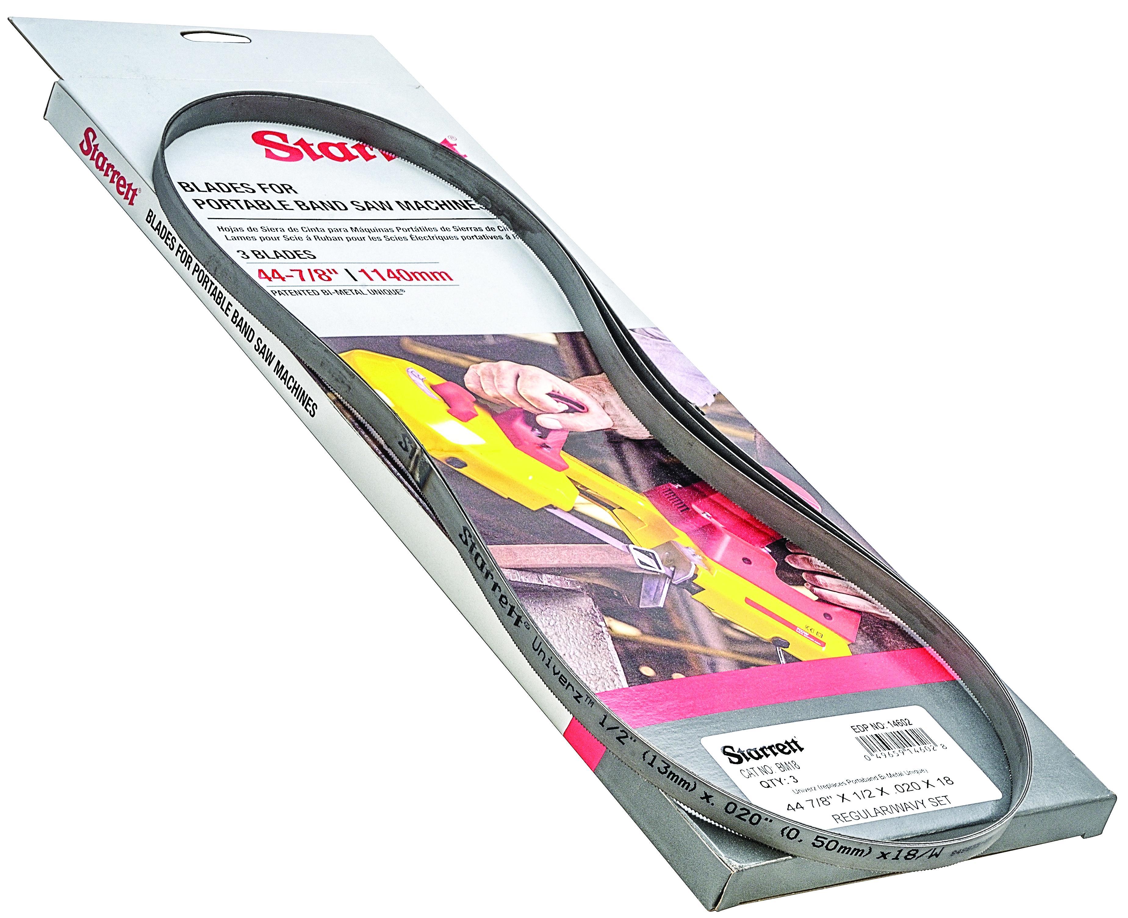 3 Ft. 8-7/8 In. Univerz™ Portaband - 1/2" Width, .020" Thickness, 18 TPI. The Univerz portable band saw blade utilizes Starrett's exclusive bi-metal unique saw technology for faster cutting and longer blade life. Blades are welded, ready to go to work in convenient lengths to fit popular portable machines. PLEASE NOTE: 3-pack sleeve. Must order in multiples of 3. Prices are for Each blade.