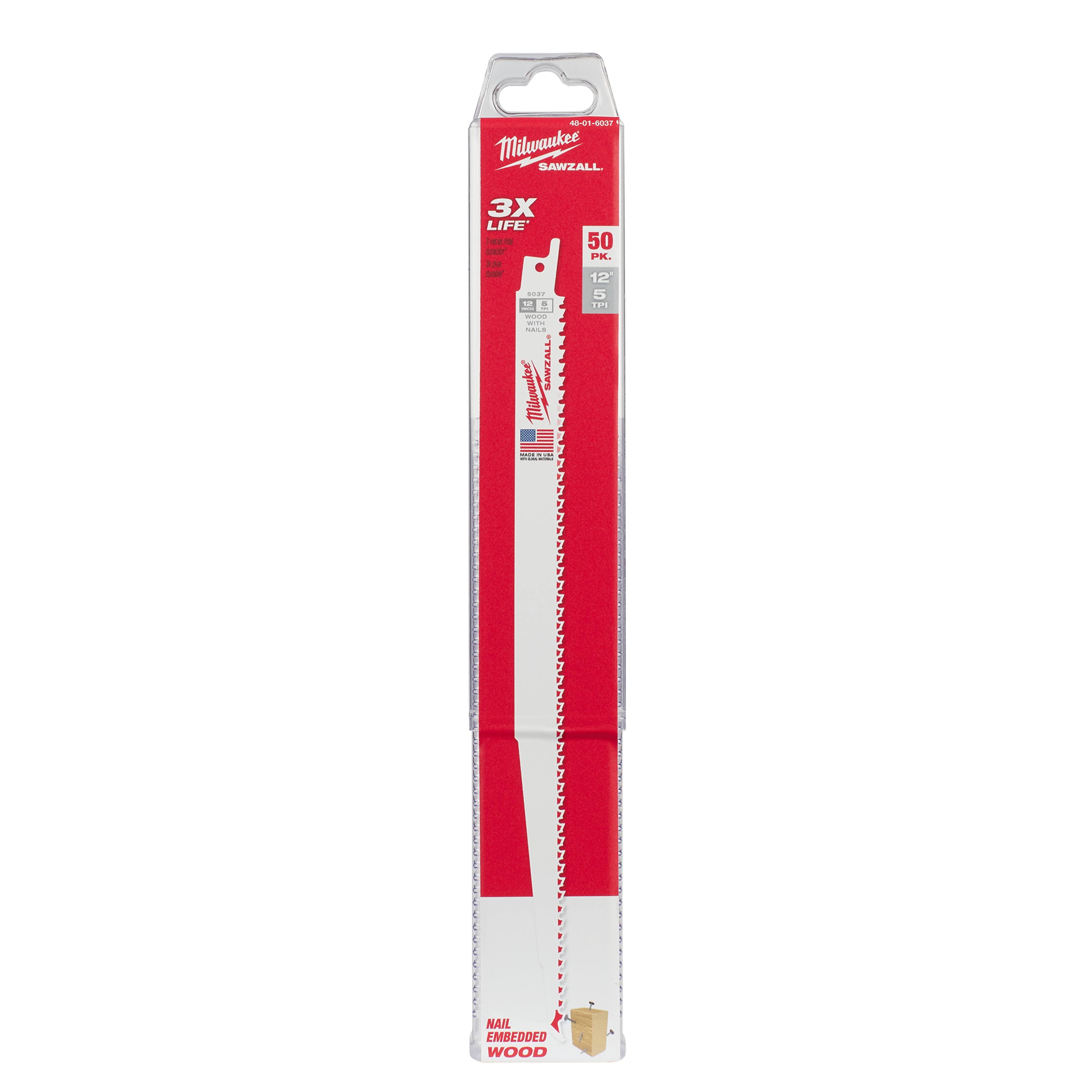 Milwaukee® SAWZALL® 48-01-6037 Heavy Duty High Performance Tapered Back Reciprocating Saw Blade, 12 in L x 3/4 in W, 5 TPI, Bi-Metal Body, Universal/Toothed Edge Tang
