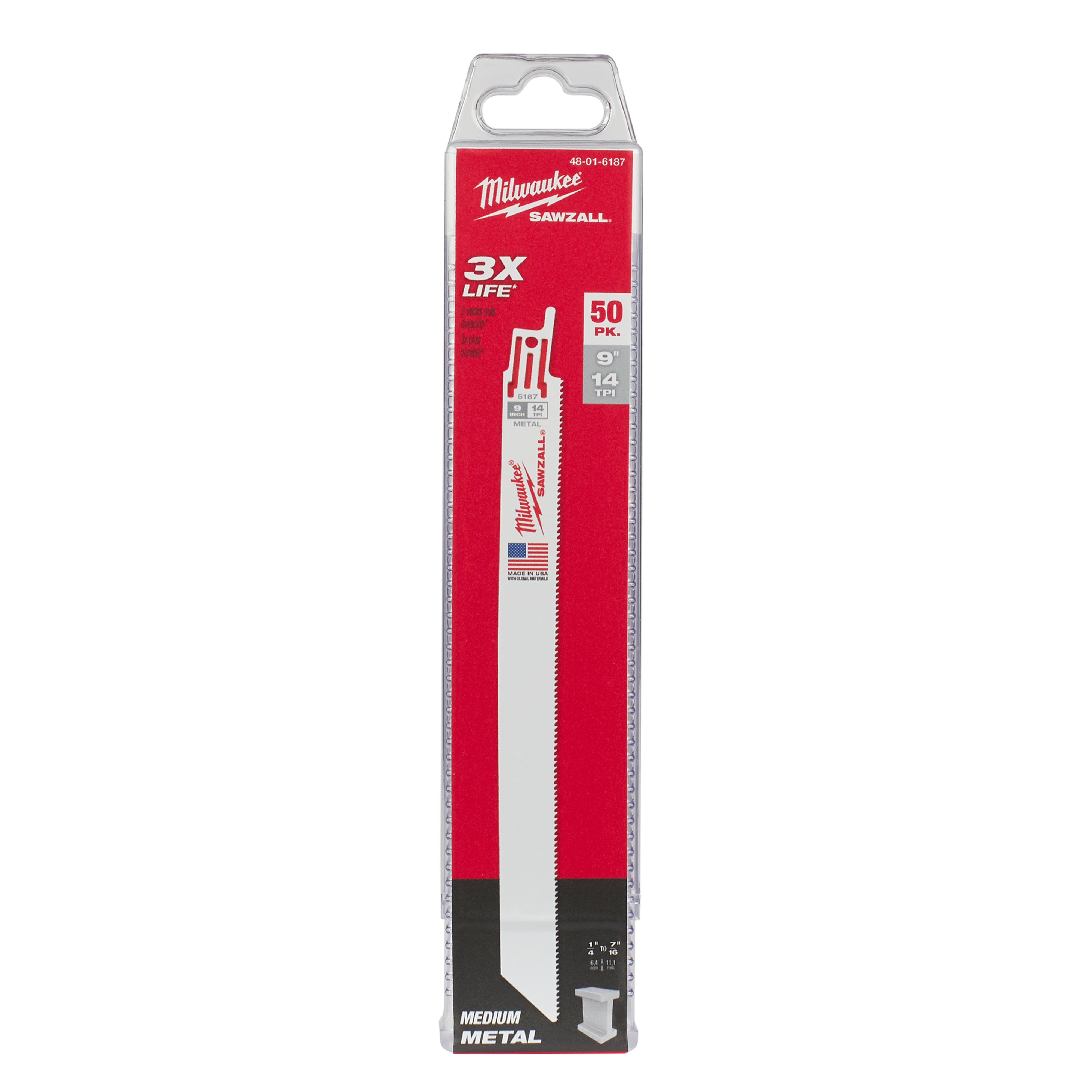Milwaukee® SAWZALL® 48-01-6187 Double Duty Straight Back Thin Kerf Reciprocating Saw Blade, 9 in L x 3/4 in W, 14 TPI, Bi-Metal Body, Universal/Toothed Edge Tang