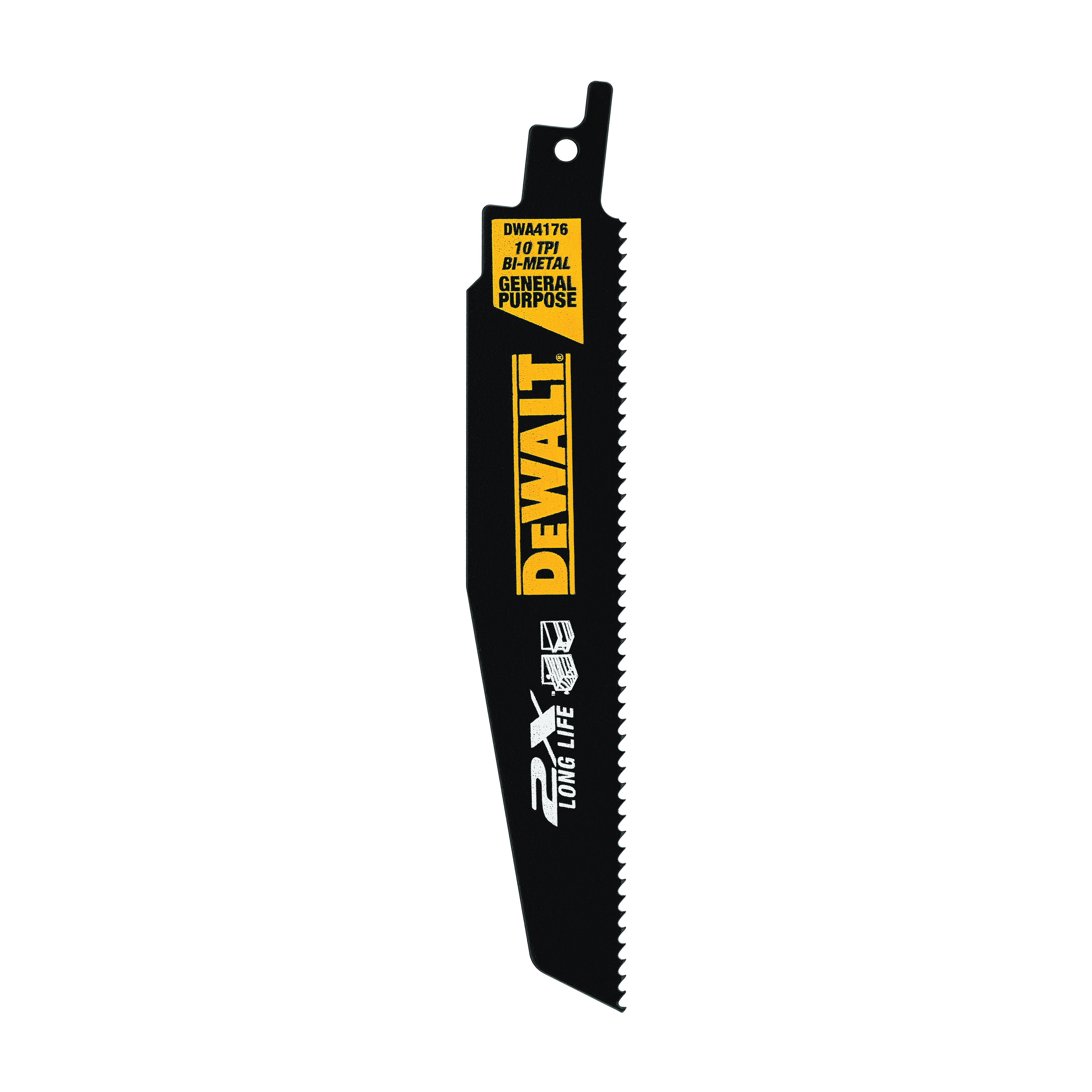 With a tall, high-speed steel strip that helps to reduce breakage and maximizes tooth life, DEWALT 2X Long Life Wood & Metal Cutting Reciprocating Saw Blades can withstand extreme jobsite conditions. An aggressive shank angle helps to increase tooth contact, and a patented design delivers fast cut rates wood and metal applications
