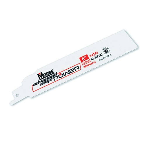 Morse RBWP64214T05 (392020), 6" x 14TPI, bimetal reciprocating saw blade is designed for cutting metal, from 1/8", up to 3/8", thickness. Wider, thicker blade body reduces blade deflection, increases rigidity, under heavier feed pressure. Five (5) blades per pack.