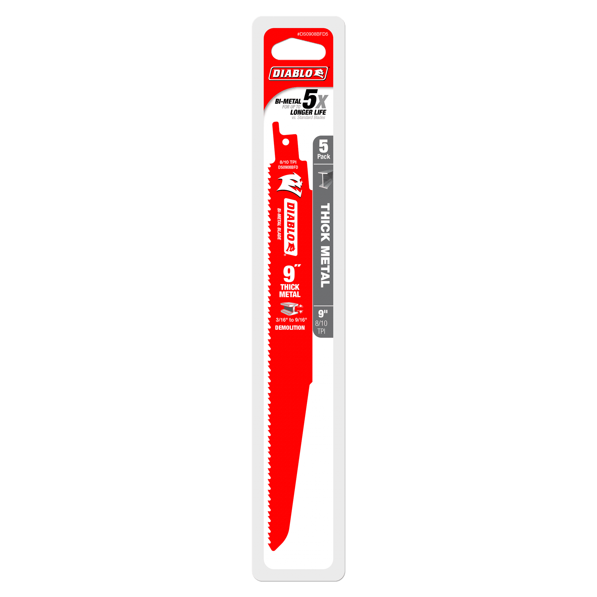 Diablo® DS0908BFD5 Bi-Metal Reciprocating Saw Blade, 9 in L, 8/10 TPI, Steel Body