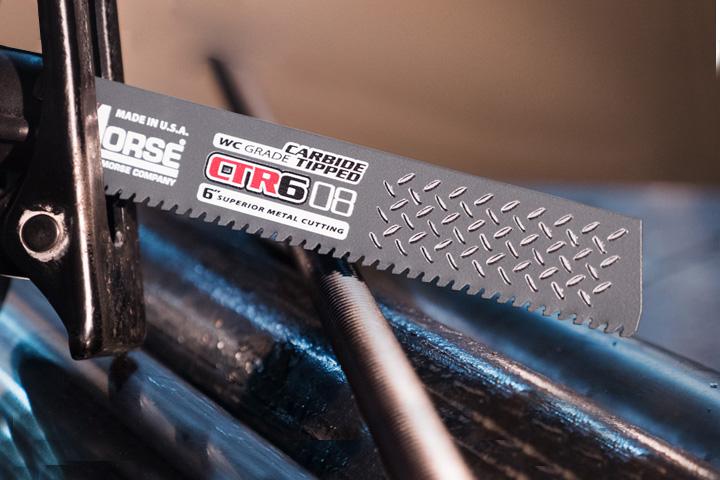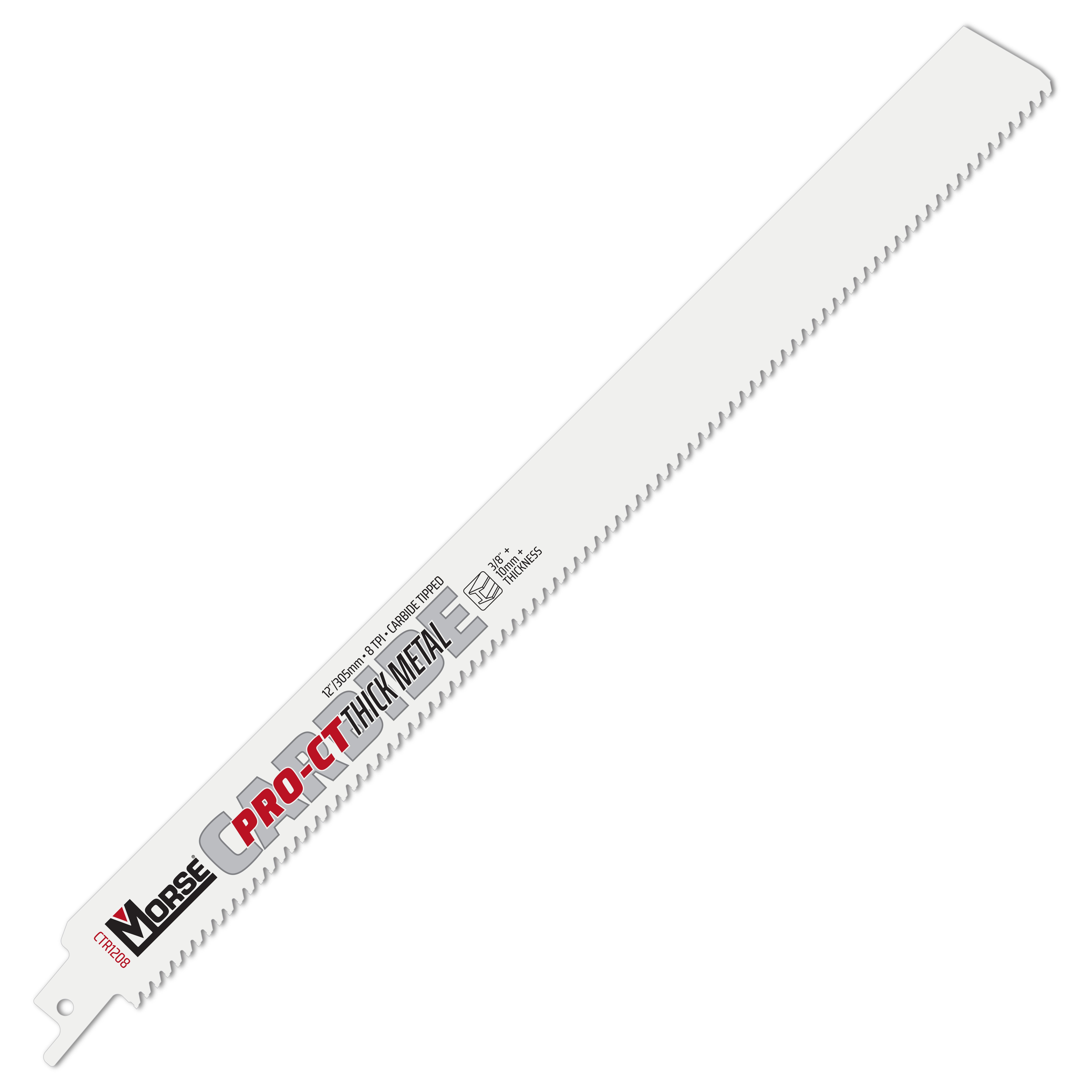 Morse CTR1208MC1 (405232), 12" x 8TPI, carbide tipped reciprocating saw blade is designed for metal and hard, abrasive cutting applications that traditional blades can't cut. Precision ground tooth profile optimizes performance in metal applications of 3/8" and thicker, as well as abrasive applications between 3/16" and 1/2". Heavy duty blade body provides rigidity under heavier feed pressure. One (1) blades per pack.