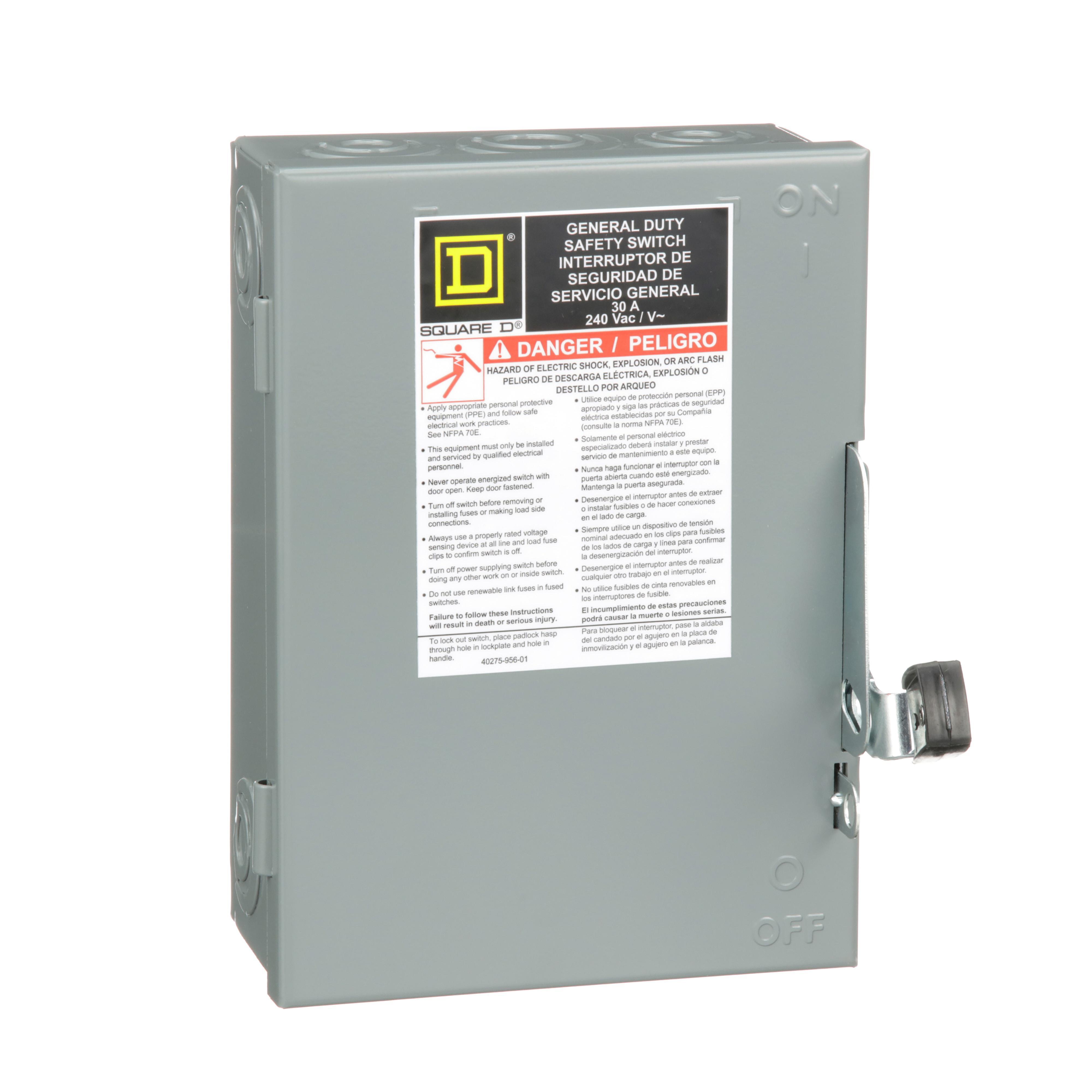 Schneider Electric's Square D general duty safety switches are designed for residential and light commercial applications where durability and economy are prime considerations. Typical loads include lighting, air conditioning, and appliances. General duty safety switches feature a quick make, quick break operating mechanism. This single throw safety switch is a fusible disconnect and has a rated current of 30A for 240VAC. This general duty switch has a 4 wire configuration with 3 poles and a factory installed neutral. The device accepts H, K or R fuse types. The enclosure is surface mounted and is a Type 1. This product has consumer packaging. General duty safety switches are UL Listed, and meet or exceed the NEMA Standard KS1.