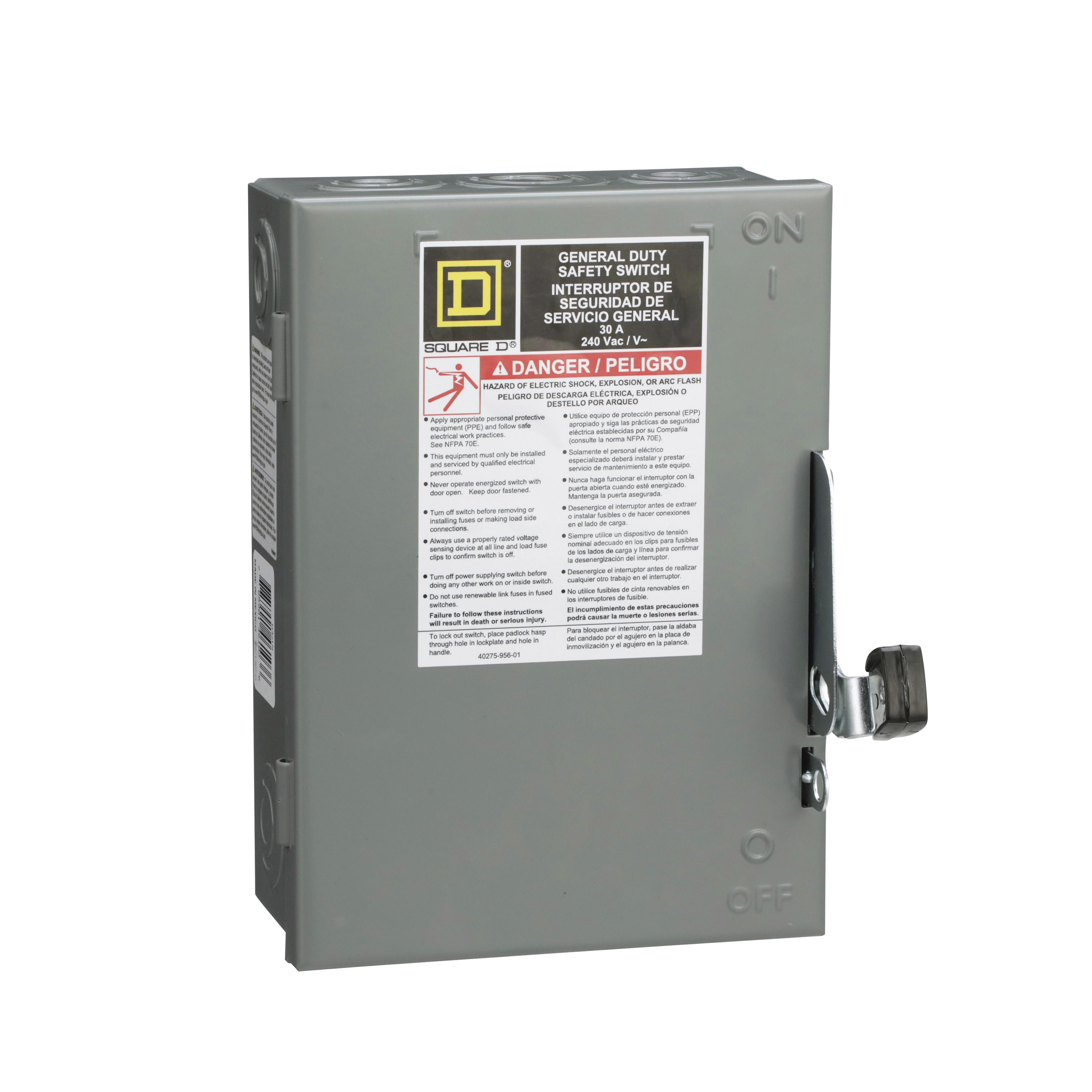Square D D321NCP Single Throw Safety Switch, 240 V AC, 30 A, 1.5 hp 240 V at AC 60 Hz, 3 hp 240 V at AC 60 Hz, 3 hp 240 V at AC 60 Hz, 7.5 hp 240 V at AC 60 Hz, 3 poles