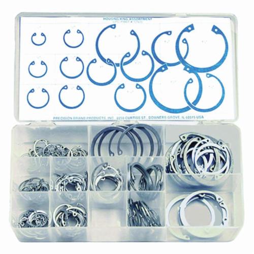 Internal rings with tapered design. Maintain constant pressure to prevent slippage of axles, gears and bearings inside machinery housing. Handy kit for shop toolroom or toolbox. On hand when needed saves time and money. Plastic compartment box is easy to store. The Precision Brand® 150-piece housing ring Assortment contains: 15 each of 1/2 in, 5/8 in, 11/16 in, 3/4 in, 13/16 in and 7/8 in, 10 each of 1 in, 1-1/16 in, 1-1/8 in and 1-1/4 in, 5 each of 1-3/8 in, 1-1/2 in, 1-5/8 in and 1-3/4 in.