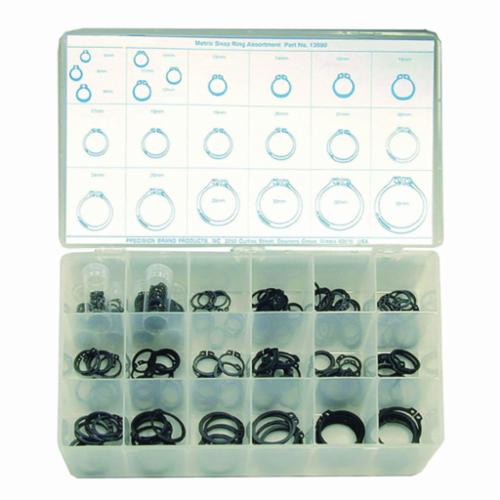 External, black phosphate coated, metric size, spring steel snap ring. Used to retain pulleys, gears or wheels on shafts. Handy kit for shop toolroom or toolbox. On hand when needed saves time and money. Plastic compartment box is easy to store. The Precision Brand® 295-piece metric snap ring Assortment contains: (25) 6 mm, (20) 8 mm, (15) 9 mm, (20) 10 mm, (20) 11 mm, (20) 12 mm, (10) 13 mm, (20) 14 mm, (15) 15 mm, (20) 16 mm, (10) 17 mm, (15) 18 mm, (10) 19 mm, (15) 20 mm, (10) 21 mm, (10) 22 mm, (10) 24 mm, (10) 25 mm, (5) 28 mm, (5) 30 mm, (5) 32 mm and (5) 35mm.