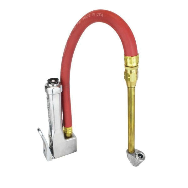 Milton® #522 dual head chuck bayonet gauge specializes in reaching dual and dually truck tires. Dual head chucks make truck/tire valves more accessible with two heads for easier access. It has lever action and is made with heavy duty construction, providing long service life even with constant use. Valve and gauge cartridges are replaceable and combined in one easy unit. Includes a 12 in hose with a pressure range that offers 10 to 120 psi (2 lb increments) or 80 to 840 kPa (20 kPa increments). The air chuck has 1/8-27 NPT threads. Complete with a jumbo white nylon indicator bar for easy reading. With 1/4 in NPT threads, all Milton® hose whips are compatible for use and have interchangeable connections with any of the 4 Milton® bayonet inflator gauge bodies: #520 (straight chuck head), #521 (single chuck head), #522 and #523 (grip chuck head to lock onto valve).