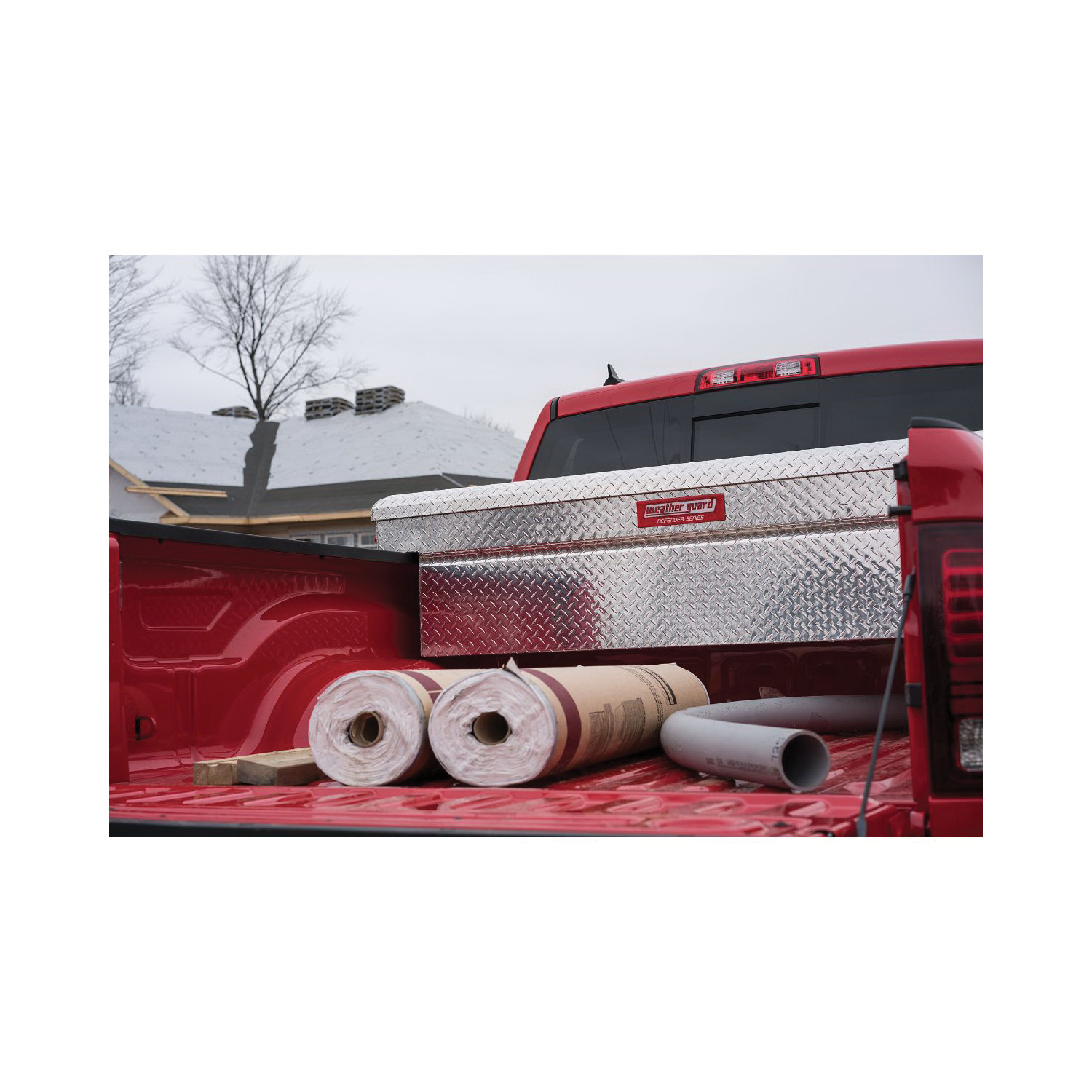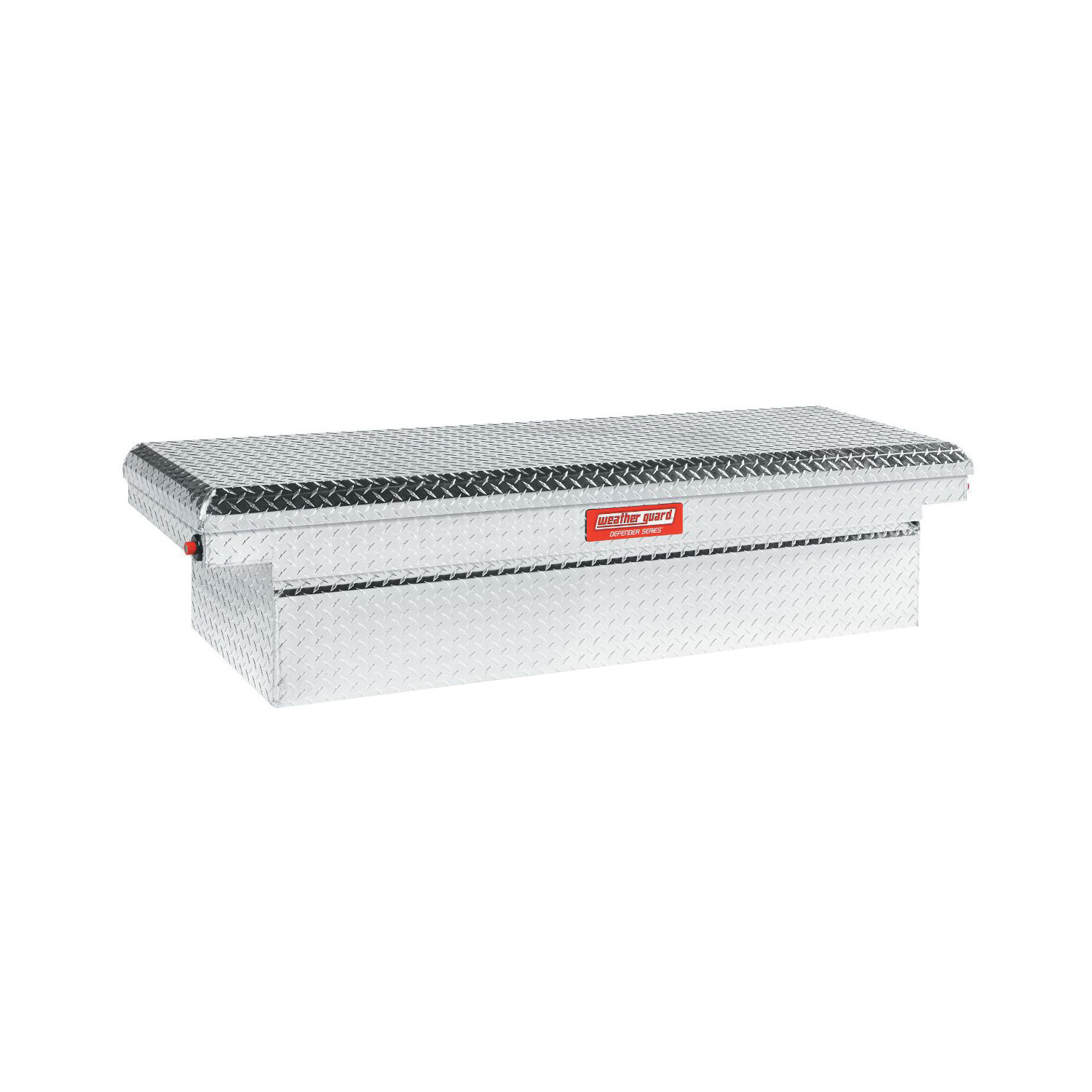 The 7.9 cu ft weather GUARD® DEFENDER SERIES™ model 300106-9-01 low profile saddle box for full size trucks provides professional Protection. This new truck box includes a tamper resistant push button lock, steel reinforced, looped strikers, D-shaped ribbed weather stripping and heavy duty four piece welded aluminum box construction. It also comes with a seven year warranty.