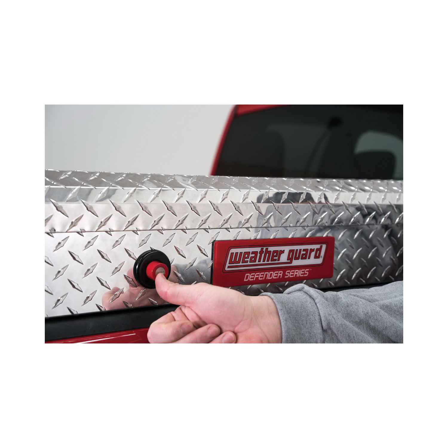 The 10.7 cu ft weather GUARD® DEFENDER SERIES™ model 300105-9-01 saddle box for full size trucks provides professional Protection. This new truck box includes a tamper resistant push button lock, steel reinforced, looped strikers, D-shaped ribbed weather stripping and heavy duty four piece welded aluminum box construction. It also comes with a seven year warranty.