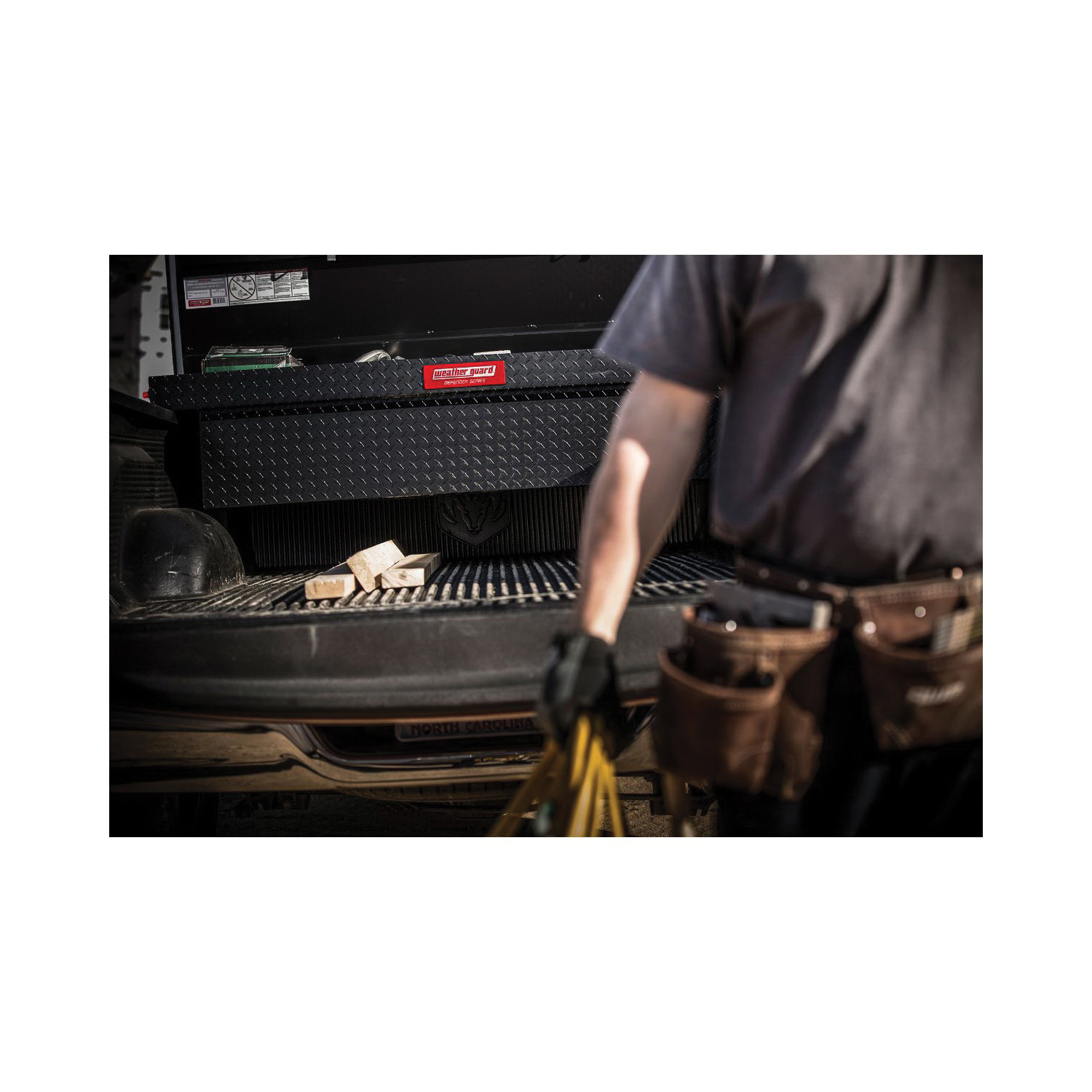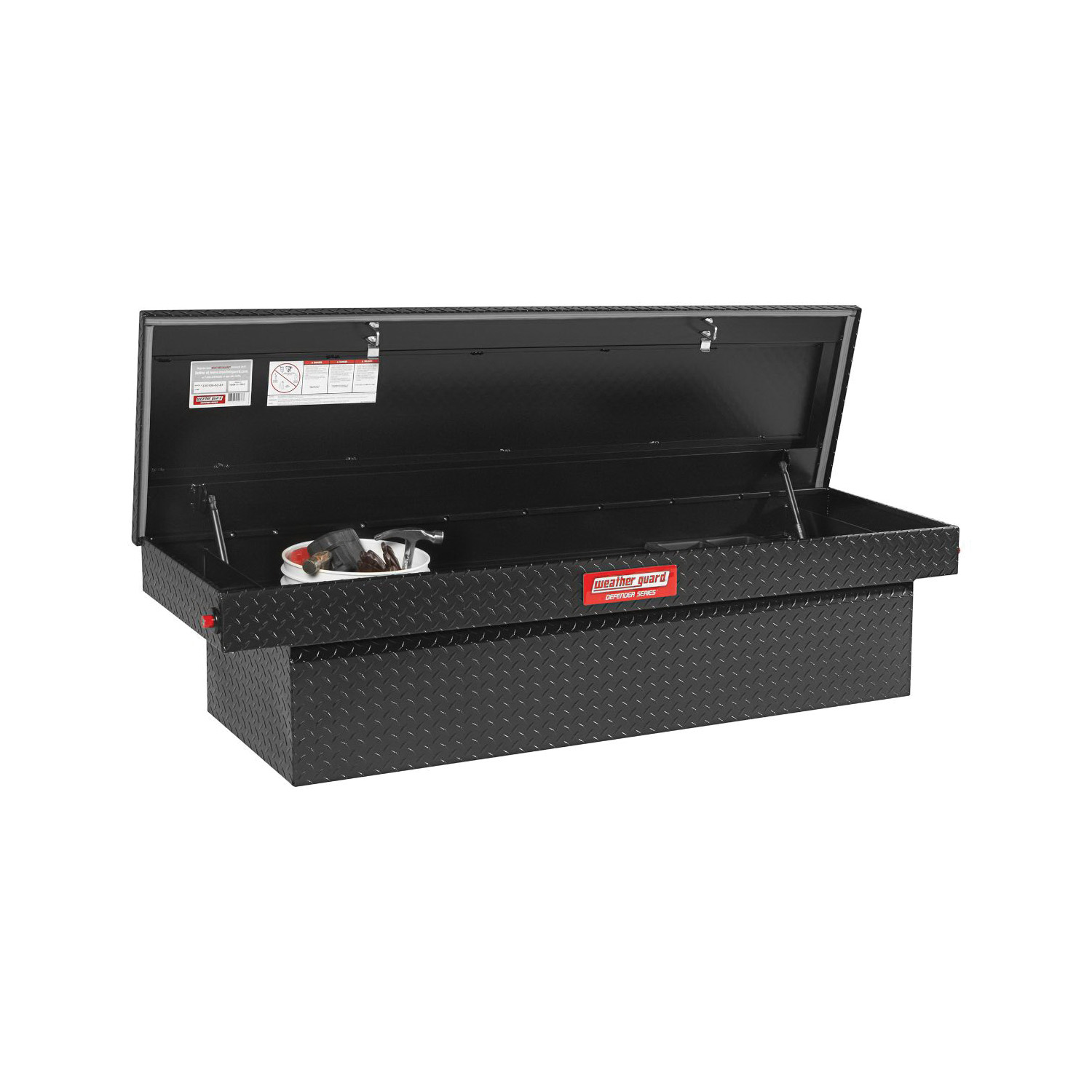 The 10.7 cu ft weather GUARD® DEFENDER SERIES™ model 300105-53-01 saddle box for full size trucks provides professional Protection. This new truck box includes a tamper resistant push button lock, steel reinforced, looped strikers, D-shaped ribbed weather stripping, heavy duty four piece welded aluminum box construction and black powder coat finish. It also comes with a seven year warranty.