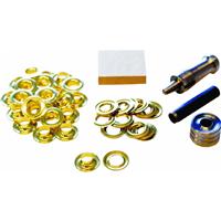 COMPLETE WITH TOOL AND RUSTPROOF BRASS GROMMETS FOR REPLACEMENT OR REPAIRS IN CANVAS OR PLASTIC. INSTRUCTIONS INCLUDED. TOOLS WITH KIT: CUTTING BLOCK, HOLE CUTTER, INSERTING PUNCH AND DIE