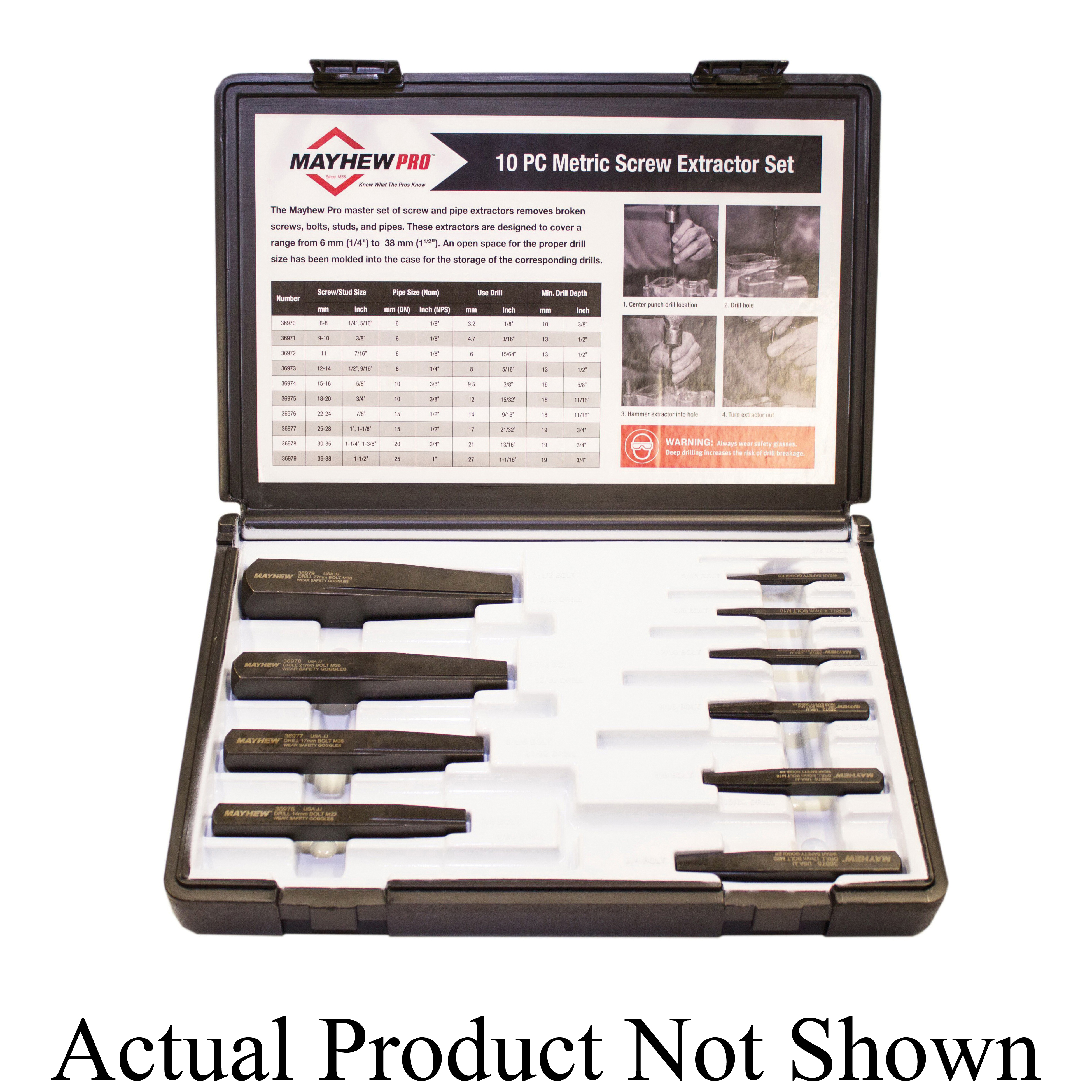 Includes36961 1/8 in, 36962 3/16 in, 36963 15/64 in, 36964 5/16 in, 36965 3/8 in, 36966 15/32 in, 36967 9/16 in, 36968 21/32 in, 36969 13/16 in Screw Extractor and Case