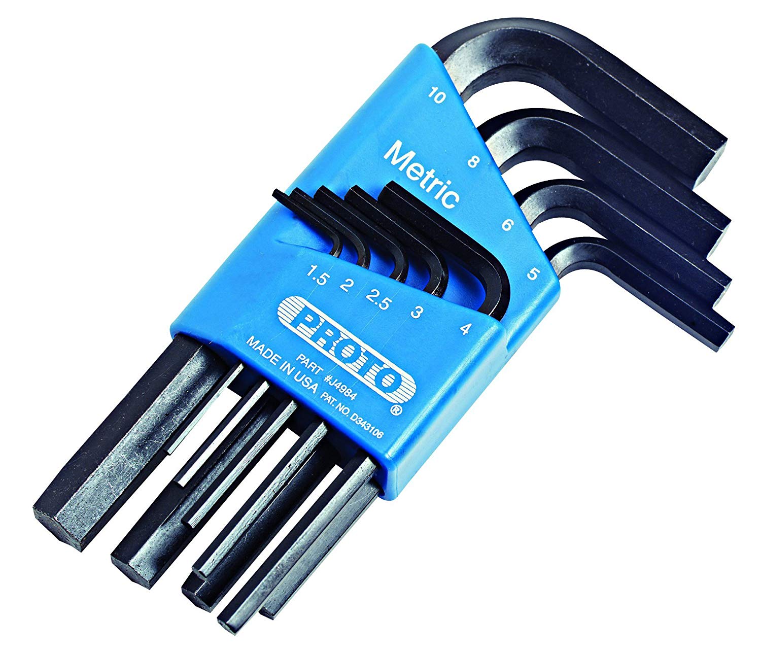 IncludesJ46306 1.5 mm, J46308 2 mm, J46310 2.5 mm, J46312 3 mm, J46314 4 mm, J46316 5 mm, J46318 6 mm, J46320 8 mm, J46322 10 mm Hex Keys and Molded Plastic Holder