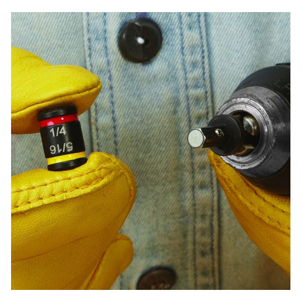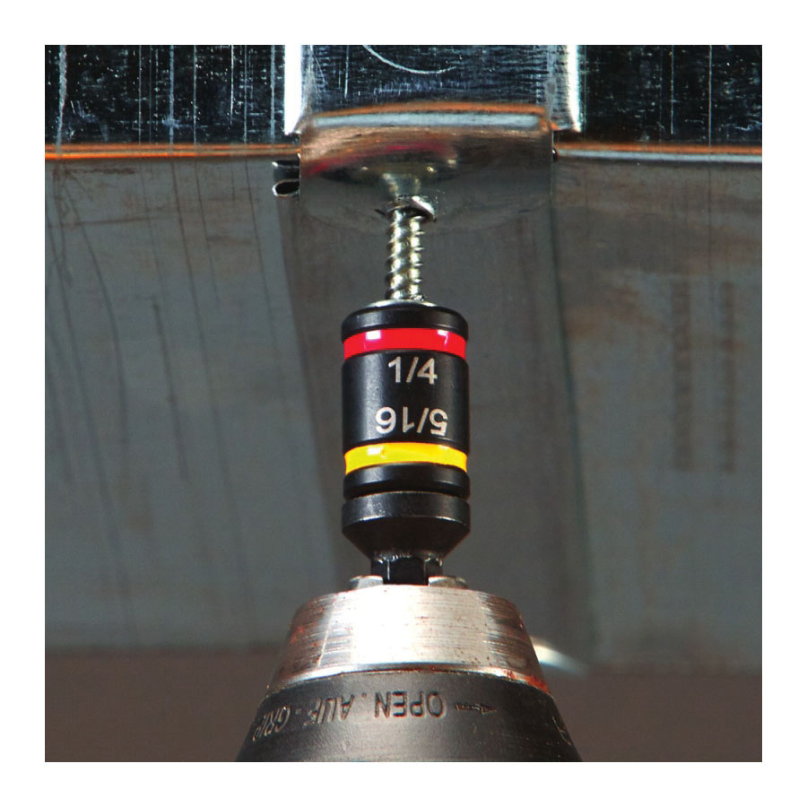 This unique, exclusive, (U.S. Patent Pending), double-duty chuck driver ensures that popular 1/4-inch and 5/16-inch magnetic hex drives are always at hands reach. The dual-sided hex socket fits over a 1/4-inch magnet-tipped, ball-detent locking hex shaft and is quickly reversed for changing sizes. Tested torque of the socket and shaft is equal to comparable one-piece single size drivers to ensure optimum screw performance. The removable, reversible socket also allows easy access for cleaning the magnet tip to eliminate any troublesome buildup of metal shavings in the hex opening. Positive engagement of hex head fasteners is never compromised. The number MSHC Reversible Hex Chuck Driver is ideal for pairing with Malco Zip-in self-piercing or Bit-Tip drill and tap metal screws.