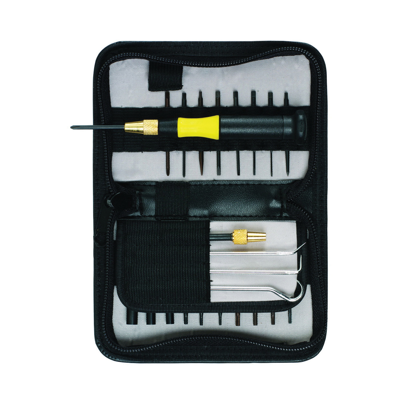 IncludesPH00, PH000, PH0000 Phillips®, 1/32 in, 3/64 in, 1/16 in, 3/32 in, 5/64 in Slotted Tip, T6, T7, T8, T9 Torx®, 1/2 in, 1/16 in, 5/64 in Hex Extended Shaft Screwdriver Blades, 3/32 in, 1/8 in, 5/32 in Nut Drivers, 35 deg Bend, 90 deg Bend, 180 deg Loop, Straight, 180 deg Hook, Triple Bend, Double Bend Probes, Handle, Blade Extension and Scratch Awl/Scriber