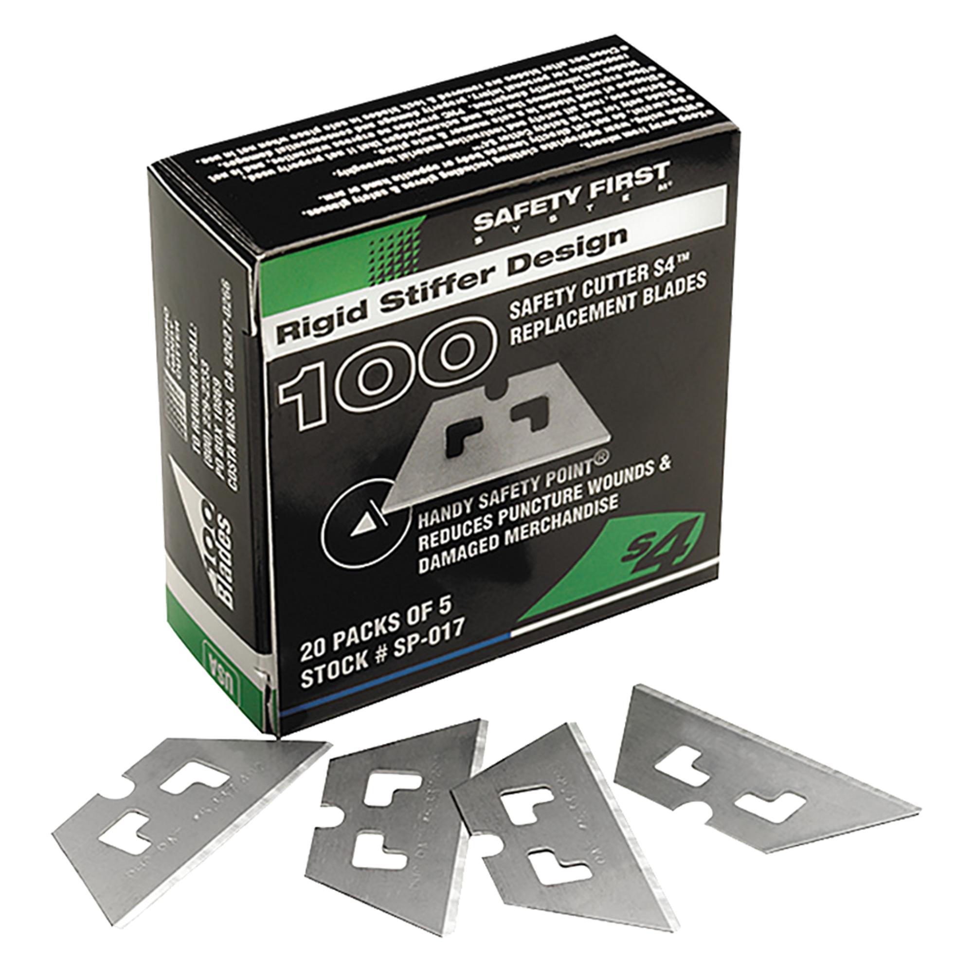 The SP-017 Blade features safety Pt. for added safety. While the blade is still extremely sharp, the blunted safety tips help prevent puncture wounds and damaged merchandise. The blade is designed to easily slice corrugated boxes and a great variety of other materials. This blade fits most safety cutters at Pacific Handy Cutter including the S4, S4S, S5, S7, S8, EZ1, EZ2+, EZ4, EZ7, GSC3, RZ3 and EZ3. The blades are packaged in a box of 100 blades and placed into paper tucks of five. For added convenience and safety the SP-017 Blades can also be purchased in our SPD-017 Blade Dispenser.
