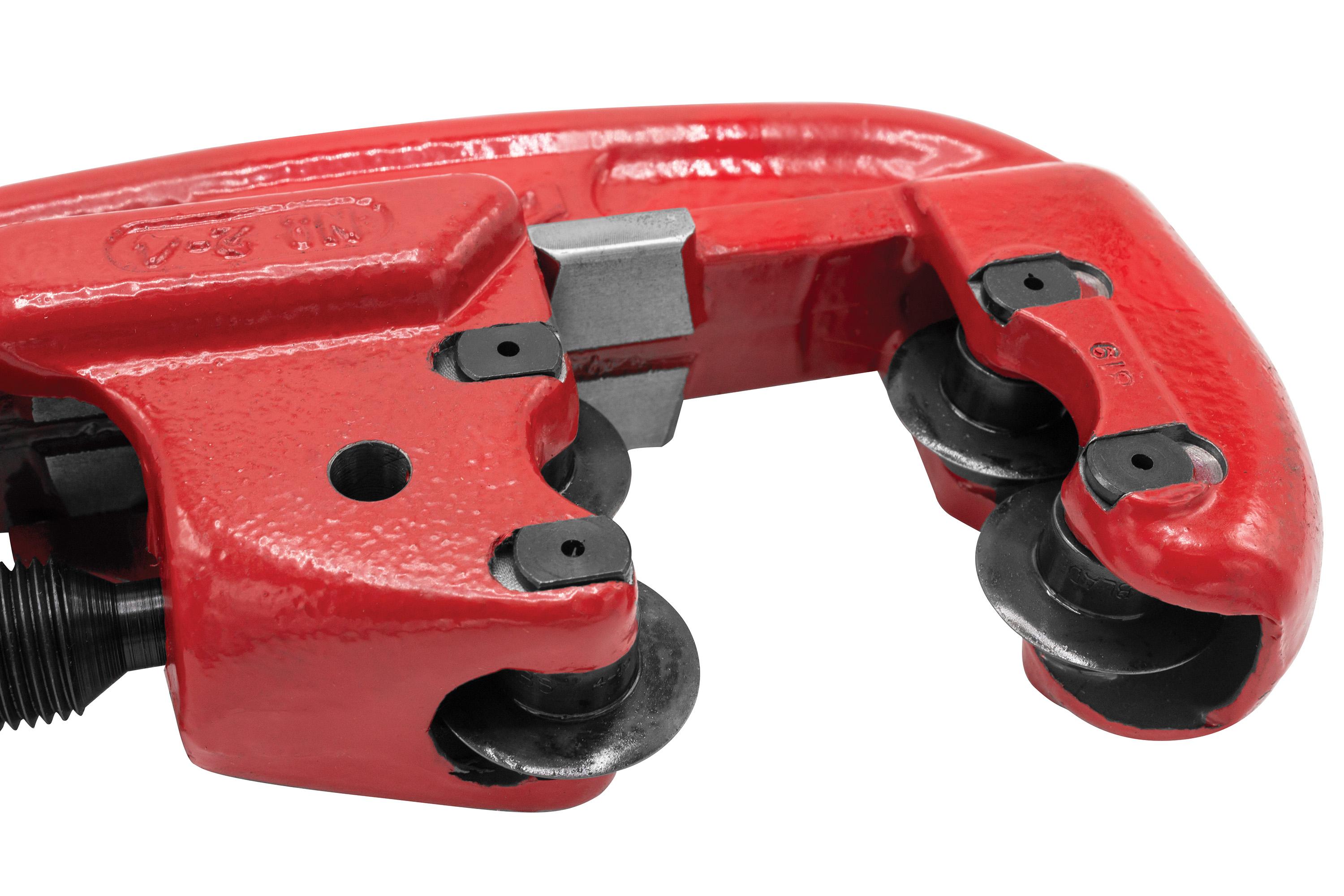 REED offers a variety of pipe cutters, both with and without guides. Standard pipe cutters without guides feature strong malleable iron frames. These pipe cutters work on steel, stainless steel, galvanized steel or cast iron pipe, depending on the installed cutter wheels. (Models ship with cutter wheels for steel.) The wide rollers help create square cuts. REED's thin profile, sharp cutter wheels allow shorter handles for work in smaller spaces. These pipe cutters leave no burr, which is great for threading jobs. The 2-3 pipe cutter with three wheels (and no rollers) means more cutting surface and less handle swing.
