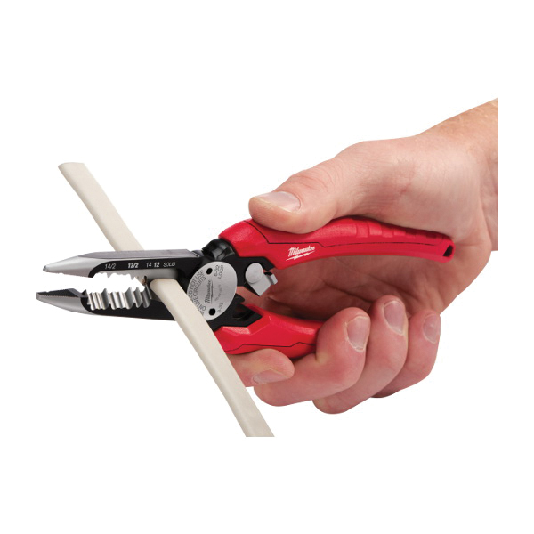 Milwaukee® 6-in-1 combination pliers for non-metallic feature a New-To-World, forged dual head design for stripping NM wire as well as needle nose functionality. A unique reaming design is integrated into the pliers head for smoothing out rough edges of metal pipe and a curved blade design allows for clean cuts through larger wire sizes. These pliers have the capability to cut #6 and #8 bolts and feature a swing-lock design for fast one-handed operation and won't open when stored in a pouch or backpack. Milwaukee® 6-in-1 combination pliers deliver maximum productivity for the trades. The Milwaukee® 48-22-3070 is perfect for the toughest of jobsites.