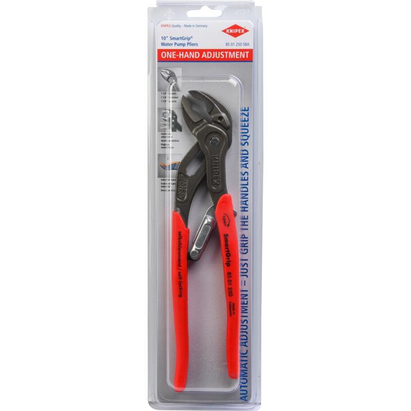 Knipex® SmartGrip™ 85 01 250 SBA Auto Adjusting Box Joint Water Pump Plier, 1-1/4 in Nominal, 1-1/4 in L x 1-3/16 in W CRV Steel V-Shape Jaw, Serrated Jaw Surface, 10 in OAL