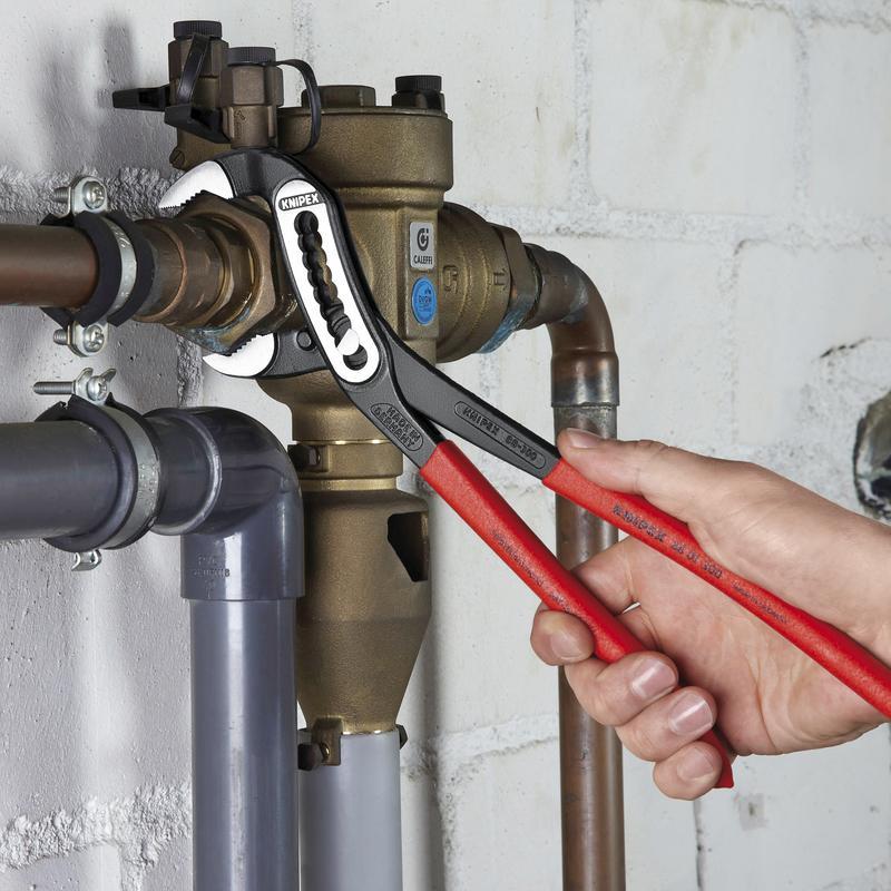 Knipex® has increased the gripping capacity of the Alligator® by 30 % and it now has 9 adjusting positions instead of the previous 7. The water pump pliers now fit even more comfortably into the hand and its slimmer head shape allows even better access to workpieces in confined areas. The Alligator® grips hexagon nuts and bolt heads with widths of up to 46 mm A/F. Expanded gripping capacity up to 2 in pipes. Great achievements for a tool of 250 mm in L.