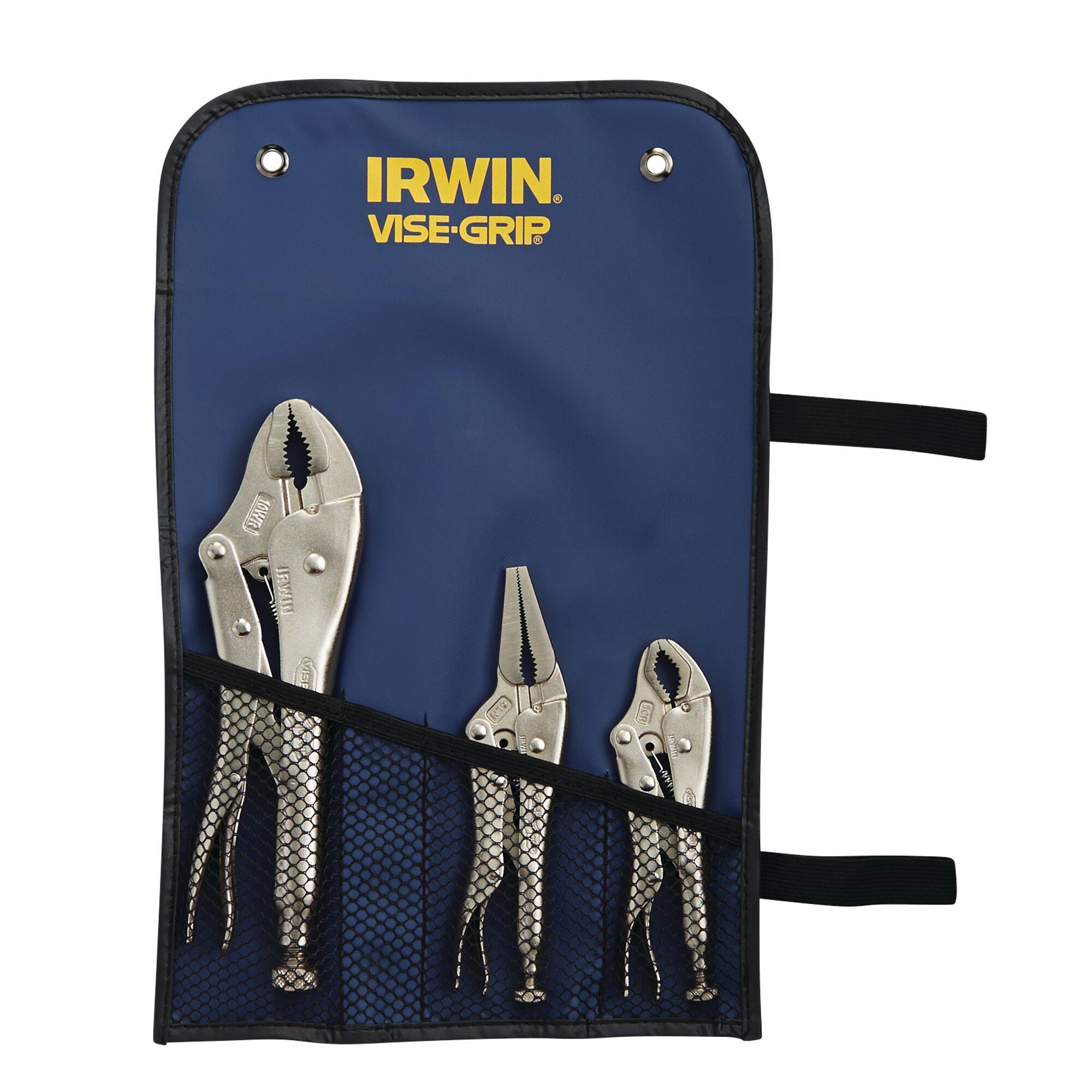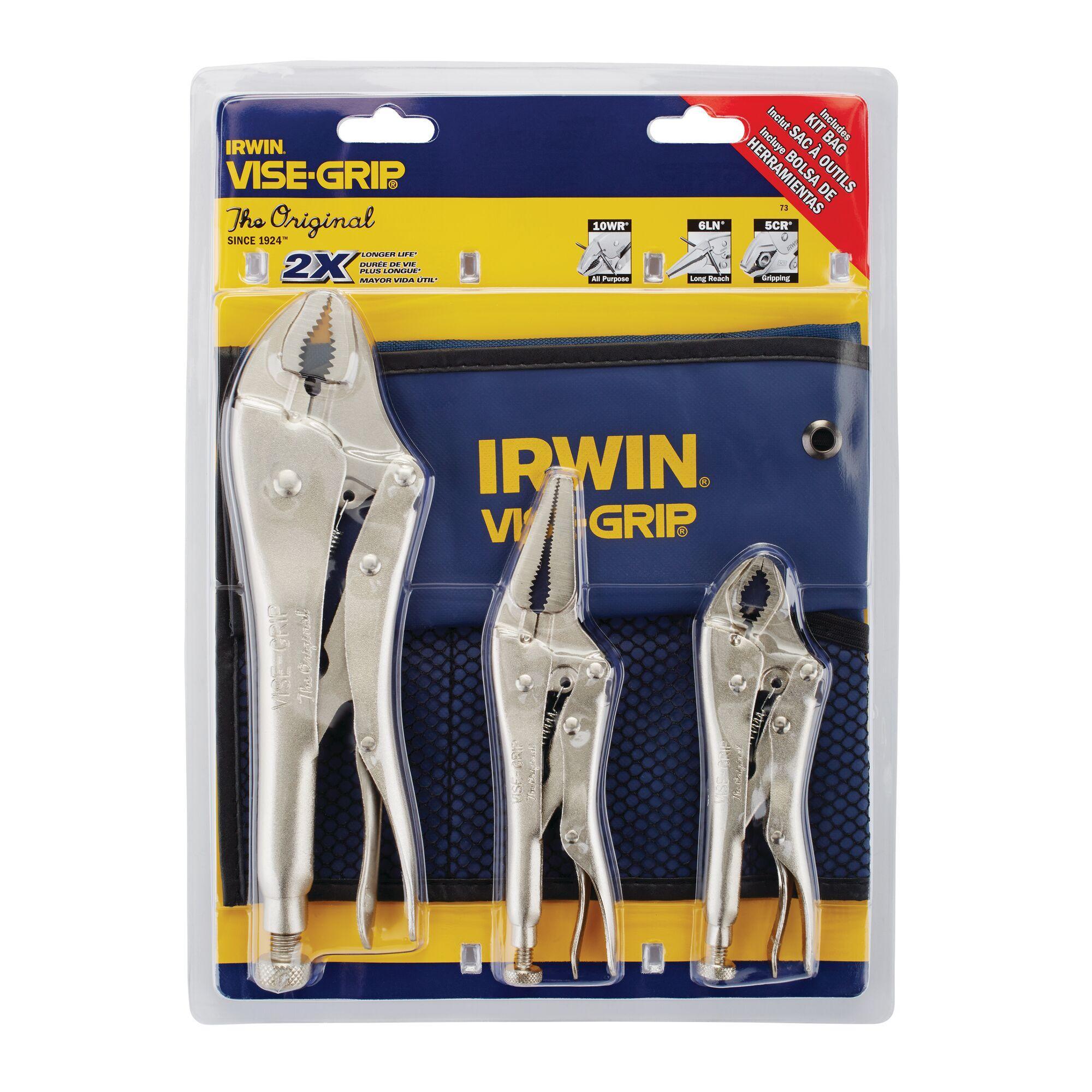 The IRWIN VISE-GRIP original 3-piece locking pliers set features high-grade, heat-treated alloy steel construction for maximum toughness and durability. Each piece of the IRWIN pliers set has hardened teeth that are designed to grip from any angle and a classic trigger release designed to provide maximum locking force. The set includes 10wr, 6ln, and 5cr locking pliers to suit a wide assortment of needs. This set also comes with a kit bag that rolls up for easy storage and transporting.