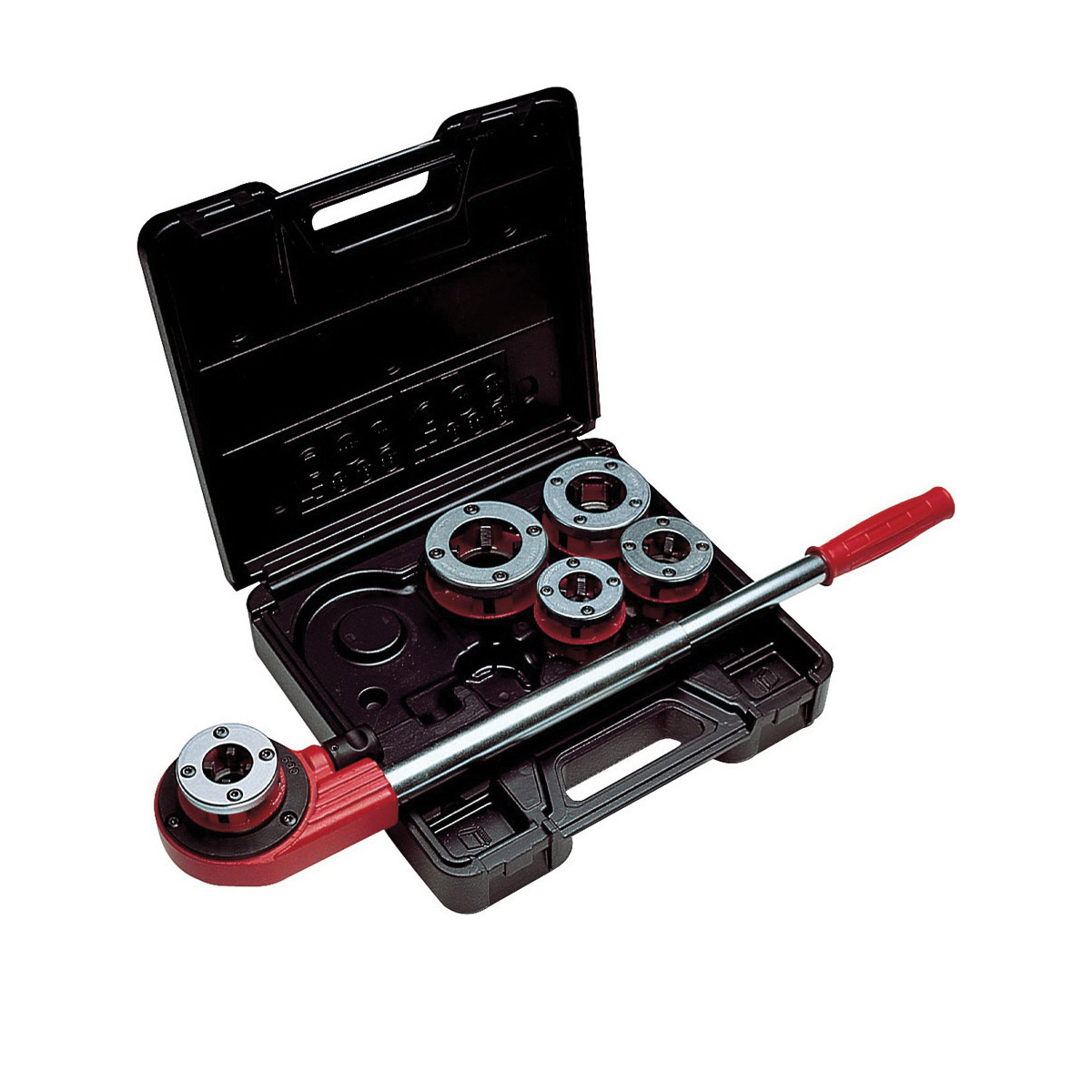 For the Enclosed Ratchet Threader Sets, the dies and dropheads are manufactured on CNC machines for cutting precision during the threading process. Sets contain enclosed dropheads and a ratchet handle in a compact, reinforced plastic carrying case. The dropheads are the lightest available, size for size. The enclosed dropheads in these sets can be used manually or with the REED 601PD Power Drive. To replace a drophead, refer to REED Enclosed Dropheads. Dropheads for pipe sizes up through 1-1/4" are interchangeable with RIDGID® 11-R and R200, Super-Ego® 600, Virax® 1362, Rothenberger™ Super Cut hand ratchet threaders and Supertronic portable power threaders.