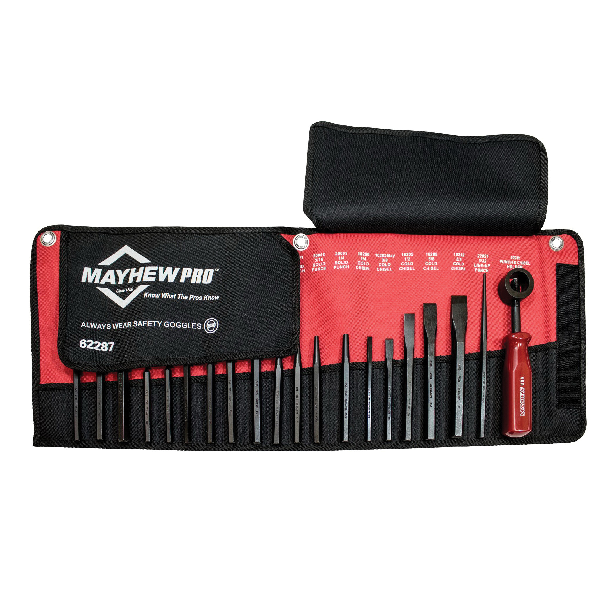 Includes10200 1/4-6 mm x 5 in, 10202MAY 3/8-10 mm x 5-1/4 in, 10205 1/2-13 mm x 6 in, 10209 5/8-16 mm x 6-1/2 in, 10212 3/4-19 mm x 7 in Cold Chisel, 23001 3/16-5 mm x 4-1/2 in Punch Prick, 24002 3/16-5 mm x 5 in, 24003 5/16-8 mm x 6 in Punch Center, 20000 3/32-2.5 mm x 5 in, 20001 1/8 x 5 in, 20002 3/16 x 5 in, 20003 1/4 x 5 in Solid Punch, 22021 3/32-2.5 mm x 8 in Punch Aligning, 21001 3/32 x 7/8 x 4-1/2, 21002 1/8 x 1 x 4-3/4 in, 21003 5/32 x 1 x 5 in, 21004 3/16 x 1-1/4 x 5-1/4 in, 21005 1/4 x 1-1/4 x 5-3/4 in, 21019 5/16 x 1-1/4 x 6 Pin Punch and 50301 Punch Chisel Holder in Handle