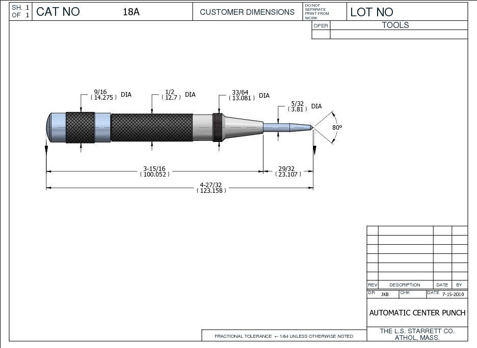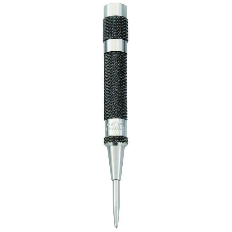 The Starrett Automatic Center Punch with Adjustable Stroke features a lightweight, knurled steel handle for a positive grip and easy handling. 125mm (5") Length, 14mm 9/16" Diameter.