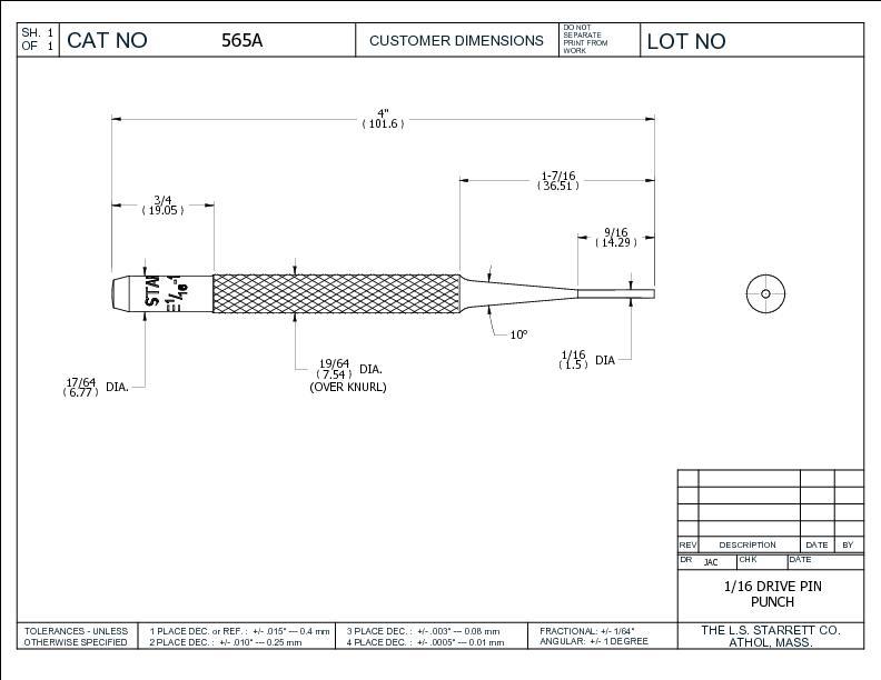 The Starrett 565 Drive Pin Punch is well proportioned, hardened, properly tempered, nicely finished, and have a knurled finger grip. Each punch has the size stamped on the head. 100mm (4") length, 1.5mm (1/16") Diameter.