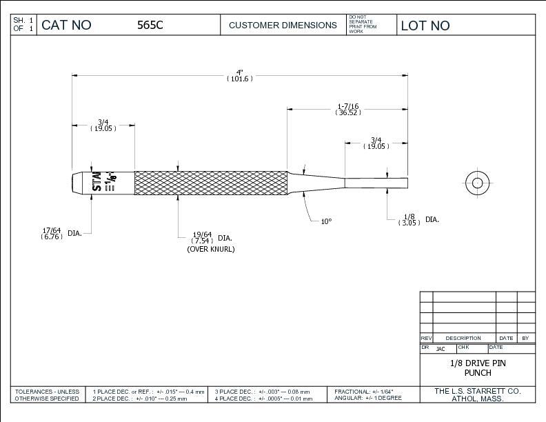 The Starrett 565 Drive Pin Punch is well proportioned, hardened, properly tempered, nicely finished, and have a knurled finger grip. Each punch has the size stamped on the head. 100mm (4") length, 3mm (1/8") Diameter.