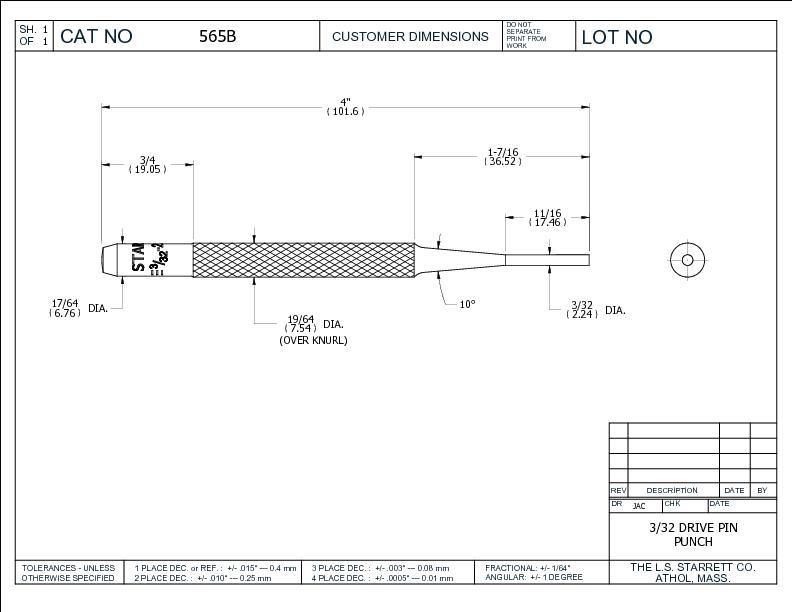 The Starrett 565 Drive Pin Punch is well proportioned, hardened, properly tempered, nicely finished, and have a knurled finger grip. Each punch has the size stamped on the head. 100mm (4") length, 2.5mm (3/32") Diameter.