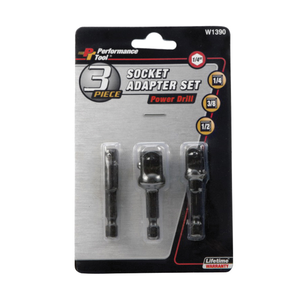 Performance Tool™ W1390 Power Drill Socket Adapter, 1/4, 3/8, 1/2 in Male x 1/4, 3/8, 1/2 in Female Drive, 2 in OAL
