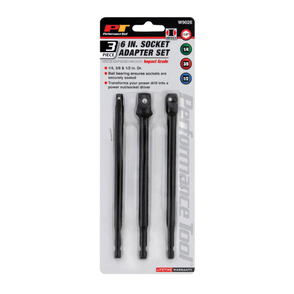 Performance Tool™ W9026 Power Drill Socket Adapter, 1/4, 3/8, 1/2 in Male x 1/4, 3/8, 1/2 in Female Drive, 6 in OAL