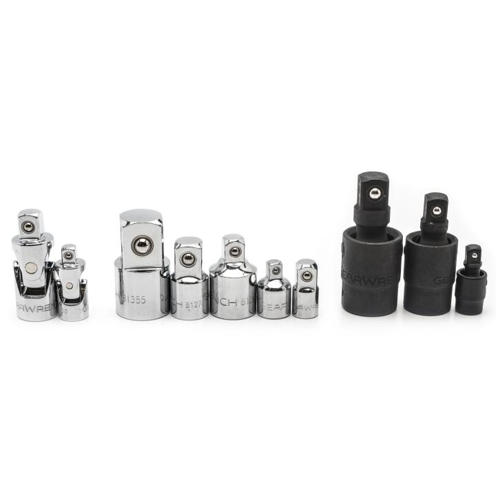 The GEARWRENCH master universal adapter set includes 1/4", 3/8", & 1/2" drive adapters and universal joints for hand and impact applications. They will allow the user to use different size ratchets, sockets, & extensions to reach all fasteners and get the job finished quickly.