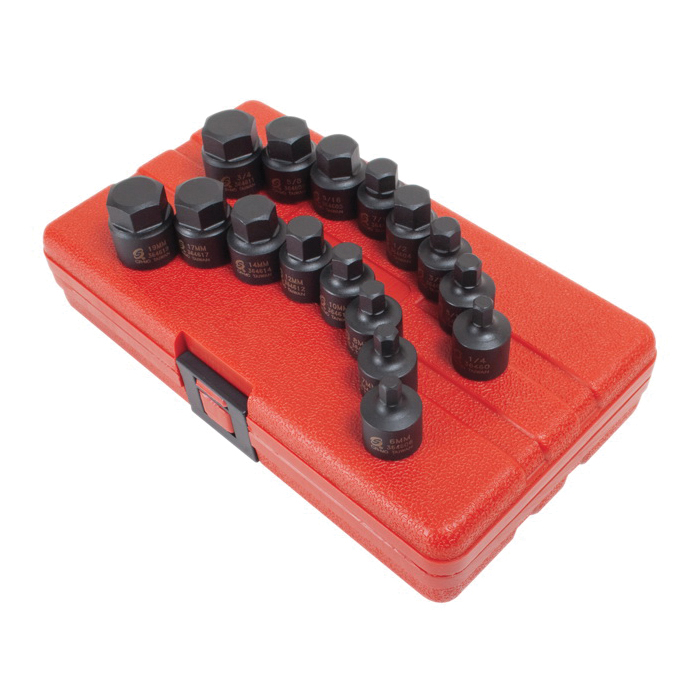 Includes36460 1/4 in, 364601 5/16 in, 364602 3/8 in, 364603 7/16 in, 364604 1/2 in, 364605 9/16 in, 364609 5/8 in, 364611 3/4 in, 364606 6 mm, 364607 7 mm, 364608 8 mm, 364610 10 mm, 364612 12 mm, 364614 14 mm, 364617 17 mm, 364619 19 mm Impact Drivers and Heavy Duty Blow Molded Storage Case