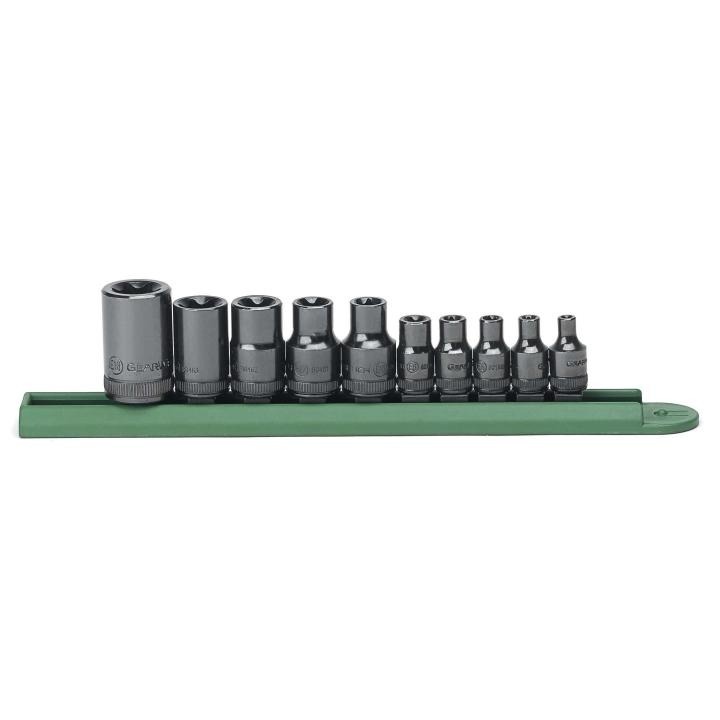 The GEARWRENCH E-Torx sockets are heat treated for added strength & durability and intended to be used on external Torx® fasteners. The hard stamped markings make identifying sizes quick and easy. The 10 piece 1/4", 3/8", and 1/2" drive set comes with a socket rail for storage and organization and includes sizes E4, E5, E6, E7, E8, E10, E12, E14, E16, and E18.