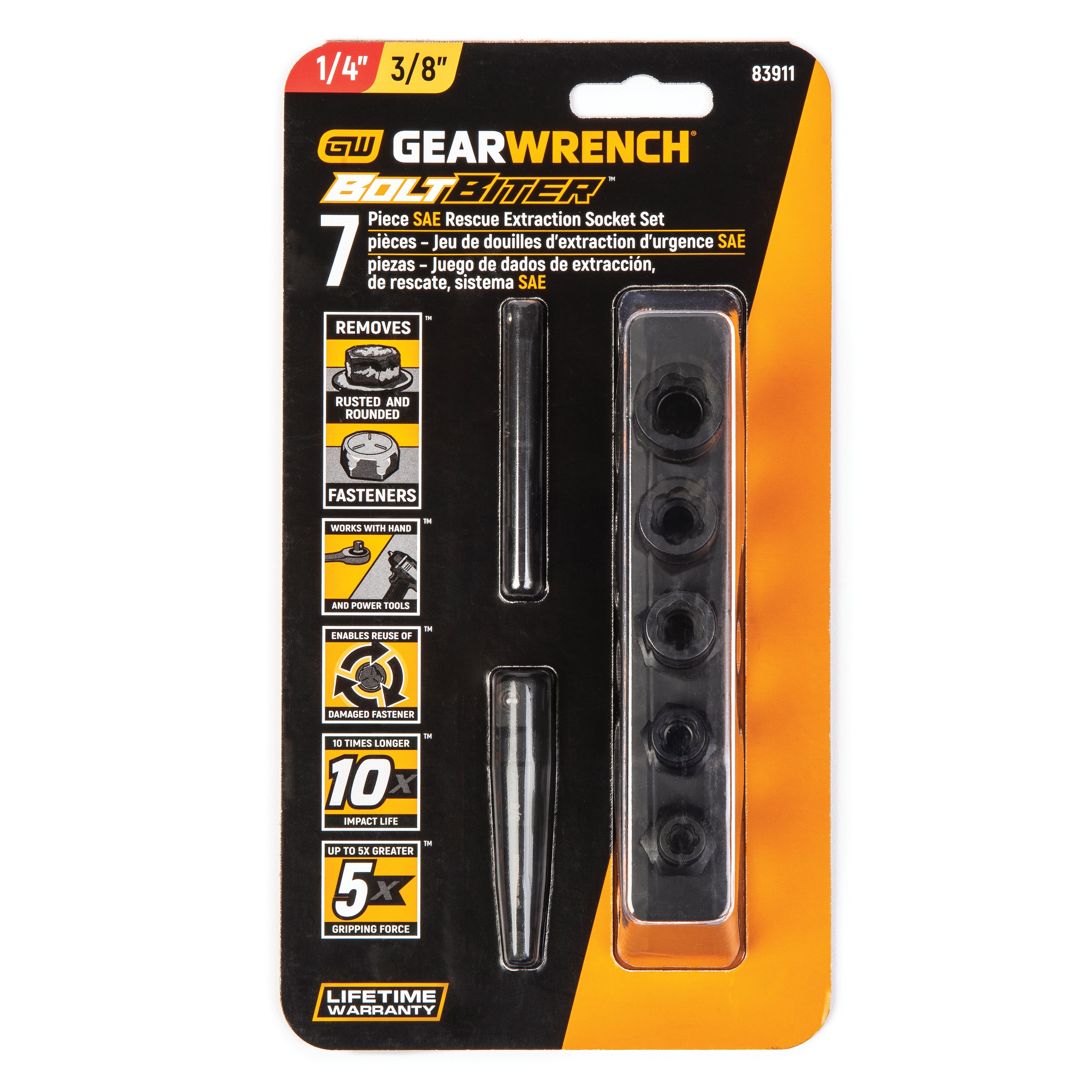 Includes(5) Bolt Biter™ 1/4 in, 3/8 in Drive Imperial Extraction Sockets and (2) Impact Adapters