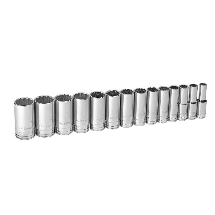 GEARWRENCH sockets are manufactured from alloy steel for maximum durability and strength. Our off corner loading design reduces fastener rounding and the chamfered opening help guide the socket on to fasteners. Our sockets feature a double line (SAE) and knurled (metric) ring help easily identify standard and metric sockets. The 14 piece 1/2" Drive 12 Point SAE Deep Length Socket Set includes sizes: 7/16", 1/2", 9/16", 5/8", 11/16", 3/4", 13/16", 7/8", 15/16", 1", 1-1/16", 1-1/8", 1-1/4", and 1-1/2".