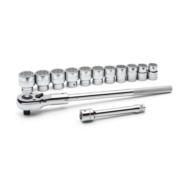 Includes80830 7/8 in, 80831 15/16 in, 80833 1 in, 80834 1-1/16 in, 80835D 1-1/8 in, 80838 1-3/16 in, 80839 1-1/4 in, 80840 1-5/16 in, 80841 1-3/8 in, 80852 1-7/16 in, 80854 1-1/2 in Standard Sockets, 81412 8 in Extension, 81400 Quick-Release Teardrop Ratchet and Metal Storage Box