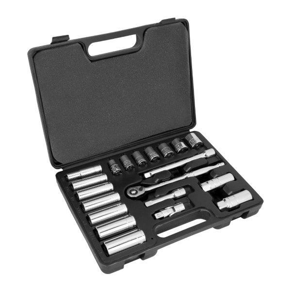 Includes(1) 3/8 in, 7/16 in, 1/2 in, 9/16 in, 5/8 in, 11/16 in, 3/4 in 6-Point Standard Sockets, (1) 3/8 in, 7/16 in, 1/2 in, 9/16 in, 5/8 in, 11/16 in, 3/4 in 6-Point Deep Sockets, (1) 5/8 in, 13/16 in Spark Plug Sockets, (1) Universal Joint, (1) 3/8 in Drive Quick-Release Teardrop Ratchet, (1) 3 in Extension and (1) 6 in Extension